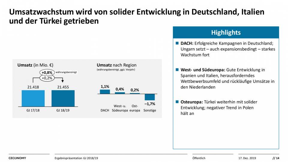 Im vergangenen Geschäftsjahr erzielte Ceconomy insgesamt einen Umsatz von 21,5 Mrd. Euro und damit währungs- und portfoliobereinigt ein leichtes Plus von +0,8%. Hintergrund sind vor allem erfolgreiche Aktivitäten rund um den Black Friday 2018 sowie diverse Marketingkampagnen. Wie erwartet haben die Regionen DACH, West- und Südeuropa sowie Osteuropa zum Umsatzanstieg beigetragen. Besonders stark ist dabei der Absatz in der wichtigen Region DACH gewachsen (währungs- und portfoliobereinigt +1,1%).