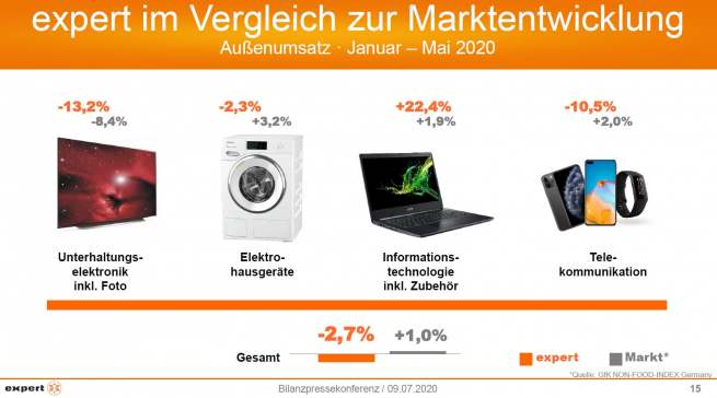 Nach der schlechten Umsatzentwicklung zu Beginn des aktuellen Geschäftsjahres durch die Auswirkungen der Corona-Pandemie konnte expert im Mai eine deutlich bessere Entwicklung im Vergleich zum Vorjahr (+23,2 Prozent) aber auch im Vergleich zum Markt – realisieren. Dieser Trend setzte sich im Juni fort.