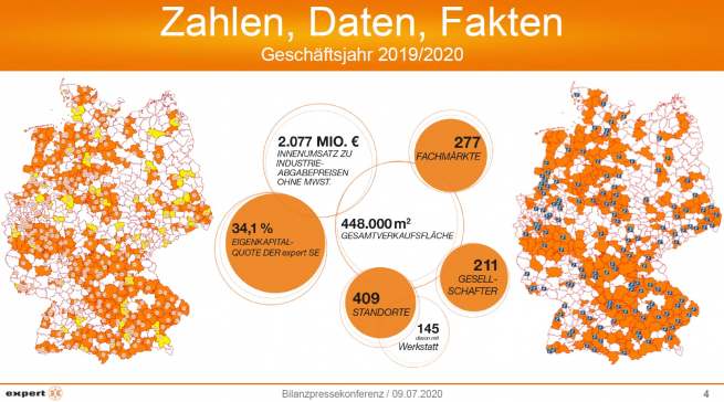 Im abgelaufenen Geschäftsjahr zählte die expert-Gruppe 211 Gesellschafter mit 409 Standorten – davon betreiben 145 eine eigene Service-Werkstatt. Die Anzahl der expert-Fachmärkte wuchs auf 277. Mit Wirkung zum 1. Oktober 2020 werden zudem drei neue Gesellschafter mit insgesamt fünf Fachmärkten und einer Gesamtverkaufsfläche von rund 8.700 Quadratmetern zu expert wechseln.