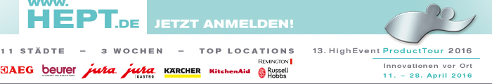 In knapp sechs Wochen ist es soweit: Ab dem 11. April geht die HEPT (High Event Product Tour) – wenn man so will, die Ur-Mutter aller Frühjahrs-Roadshows – mit Ihrem Verwöhnprogramm auf große Deutschlandtour und lädt Fachhändler an insgesamt elf Standorten ein, sich aus erster Hand über die neuen Saison-Highlights der Elektrogerätebranche zu informieren. Die elf bundesweiten Ausstellungsorte ermöglichen dem Händler kurze Anfahrtswege; Öffnungszeiten von 16 bis 22 Uhr erlauben einen Besuch auch nach Ladenschluss. Mit dabei sind in diesem Jahr erneut die Marken AEG, Beurer, Jura, Jura Gastro, Kärcher, KitchenAid und Remington/Russell Hobbs. Einige haben uns schon jetzt verraten, was die Fachhändler in ...