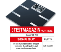 Tageslichtlampe TL 55 Day & Night: Hier gefiel den ETM-Testern besonders die Verarbeitung, der niedrige Stromverbrauch und die lange Akkulaufzeit.In Heft 04/2017 hat das ETM Testmagazin zehn Körperanalyse-Waagen geprüft und verglichen. Die Beurer Diagnosewaage BF 700 erhielt im Vergleichstest mit 93,27% die Testnote „Sehr gut“. Ein „Sehr gut“ erhielt zudem die ...