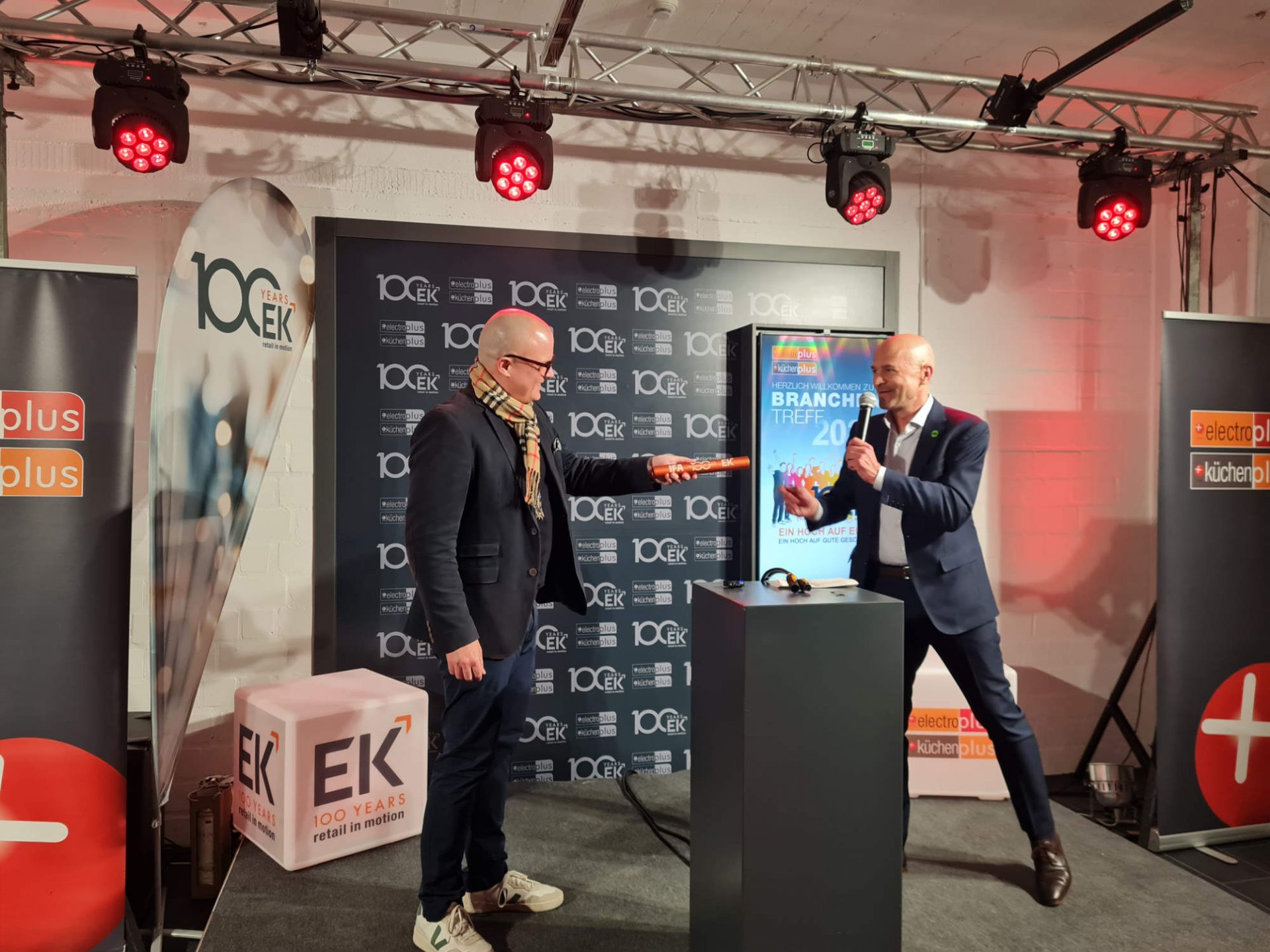 „Ein Jahrhundert EK steht für Wandel, Stärke und Zusammenhalt“, betonte Jochen Pohle, Chief Retail Officer bei EK Retail, am Mittwoch vergangener Woche bei der 2. Auflage des Branchentreffs von Electroplus und Küchenplus, zu dem die Leuchtturmhändler der beiden erfolgreichen EK System-Formate genauso zugegen waren wie das „Who is who“ der Industriepartner sowie die Macherinnen und Macher der Berliner IFA, u.a. Leif Lindner (CEO IFA Management) und Dr. Sara Warneke (gfu). Ein besonderer Moment: Dirk Koslowski (IFA-Executive-Director) übergab den Staffelstab von 100 Jahre IFA an Jochen Pohle (100 Jahre EK Retail).