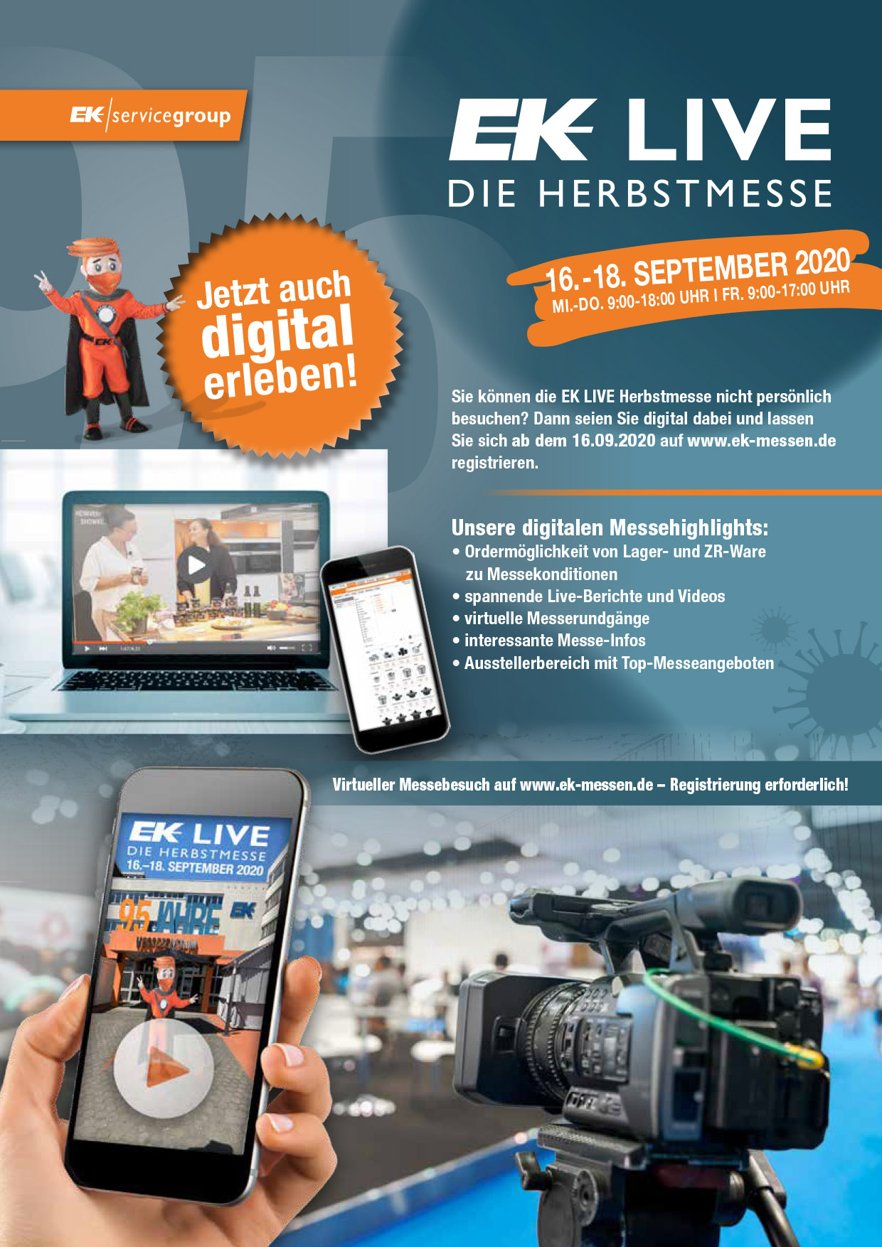 Neben attraktiven Sortimenten und Konzepten, die die gedämpfte Kauflust wieder ankurbeln sollen, neben Digital Services, die genau auf die Zielgruppen abgestimmt sind und neben einem Dienstleistungsangebot, das den Händlern Kopf und Rücken frei hält für die volle Konzentration auf den Kunden, bieten die Bielefelder diesmal noch mehr: Das neue, hybride Messekonzept erweitert die Live-Veranstaltung virtuell und ermöglicht die interaktive Teilnahme per Tablet, PC oder Smartphone von wo aus auch immer. Voraussetzung auch für die virtuelle Messeteilnahme ist die Registrierung auf www.ek-messen.de. Ausführliche Berichterstattung in unserem Business-Newsletter am 27. August.