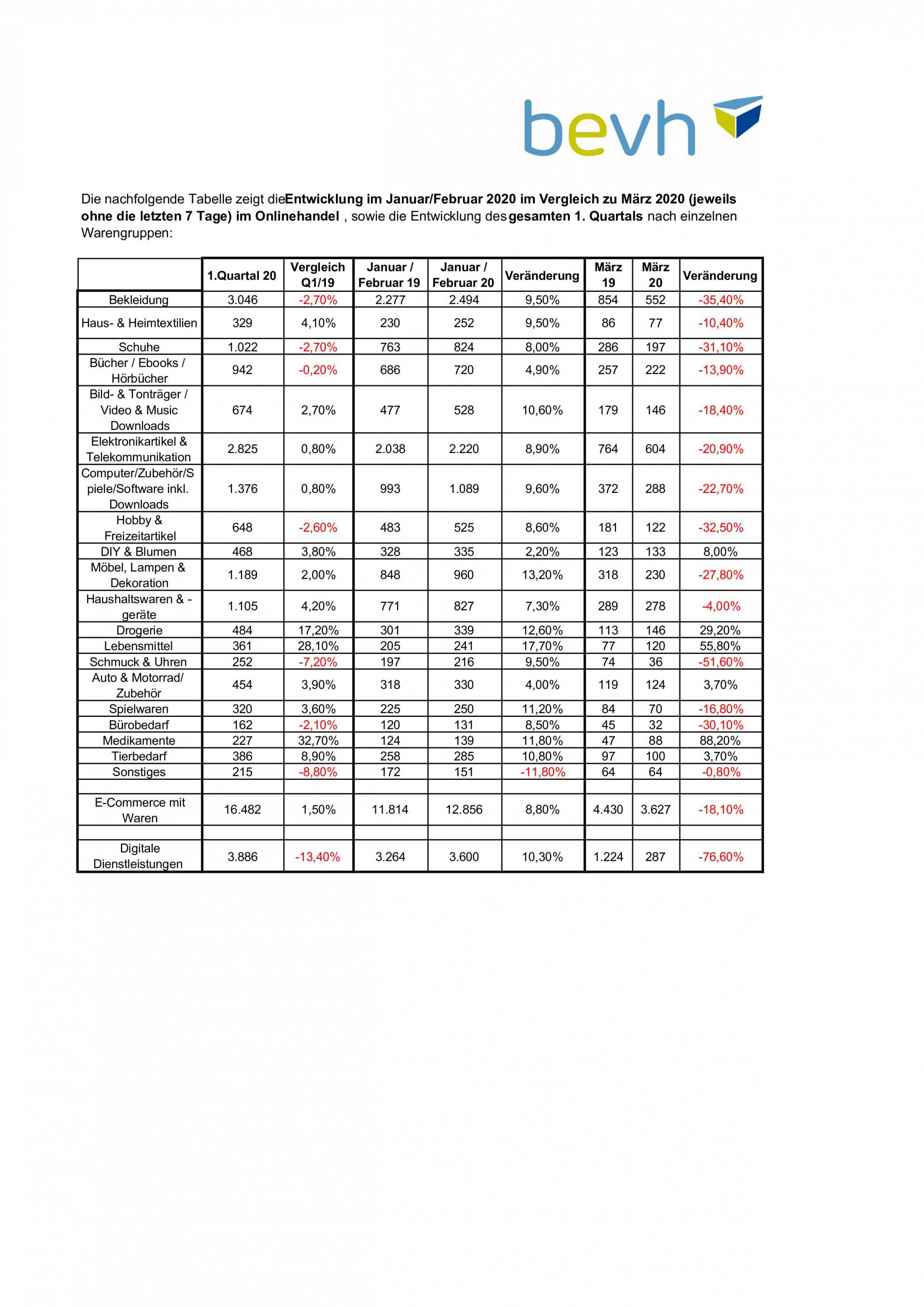 Zusätzlich zu den wöchentlich erhobenen Konsumenten-Informationen hat der bevh seit Anfang März regelmäßig seine Mitglieder nach der Geschäftslage befragt. Erst in den letzten Märztagen, die in der Konsumentenbefragung nicht mehr erfasst werden konnten, zeigte sich eine Belebung der Nachfrage, die den aufgelaufenen Umsatzverlust jedoch bei weitem nicht wettmachen kann.