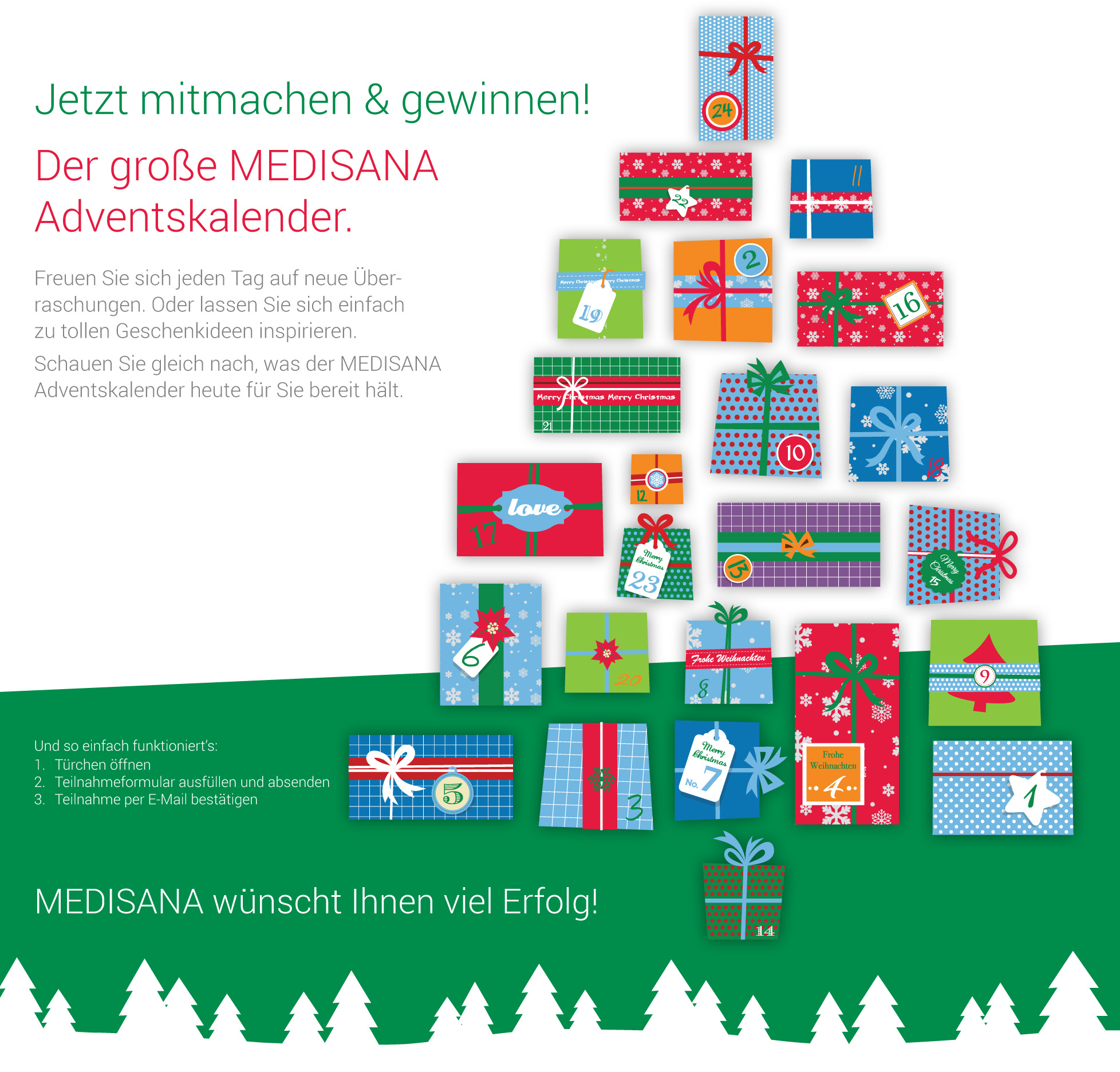 Verlost werden viele innovative Produkte aus den MEDISANA-Kategorien: Mobile Gesundheit, Gesundheitskontrolle, Sport, Wellness, Therapie, Gesundes Zuhause und Körperpflege. Daher lohnt es sich, jeden Tag auf www.medisana.de vorbeizuschauen und beim Online-Adventskalender mitzumachen. Die Teilnahme ist ganz einfach: Ein Türchen per Mausklick öffnen, Teilnahmeformular ausfüllen, die Teilnahme per E-Mail bestätigen und Daumen drücken. Mit etwas Glück macht sich einer der tollen Gewinne noch vor Weihnachten auf den Weg. Die Gewinner werden per E-Mail benachrichtigt.