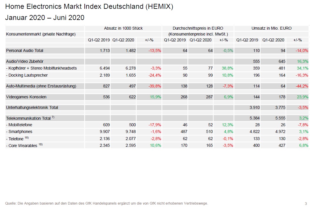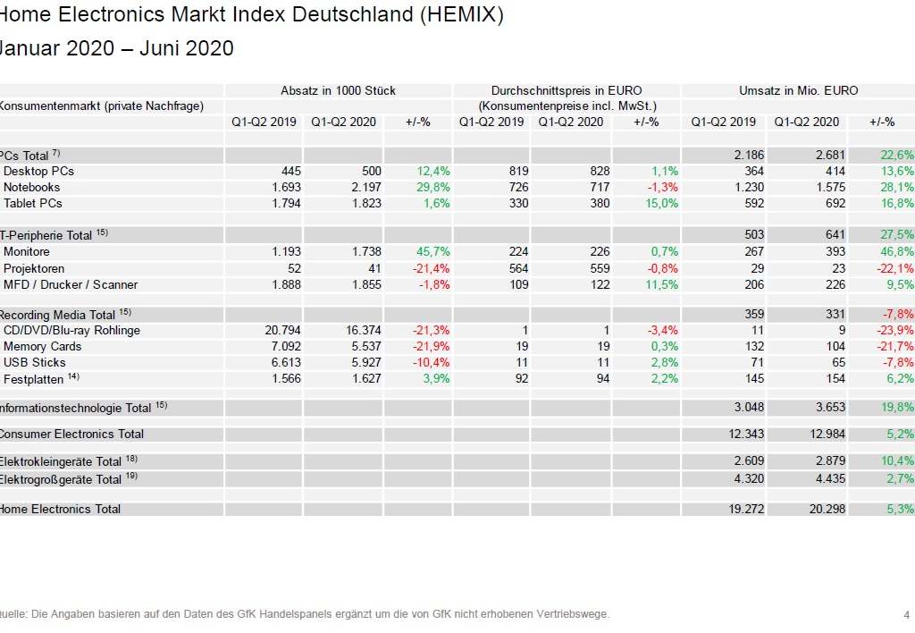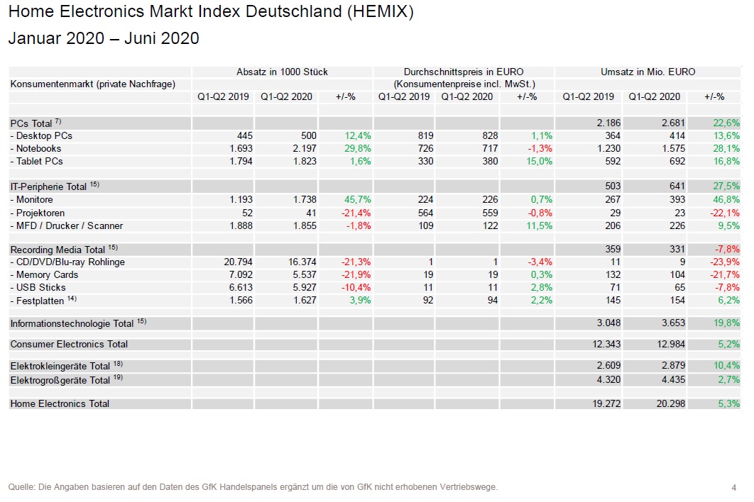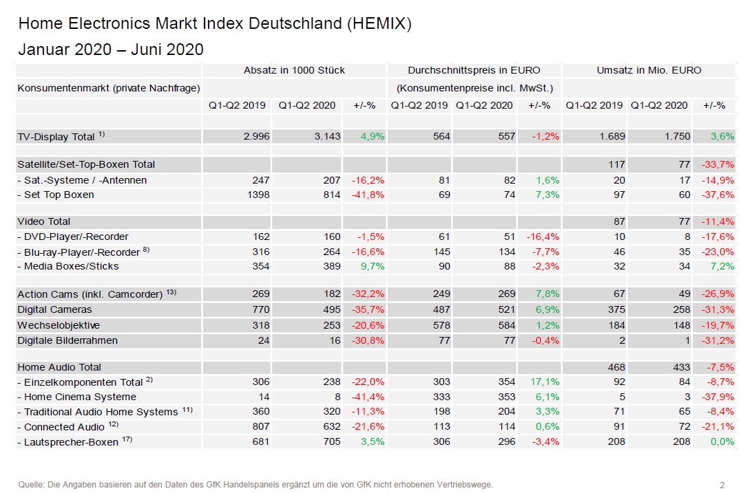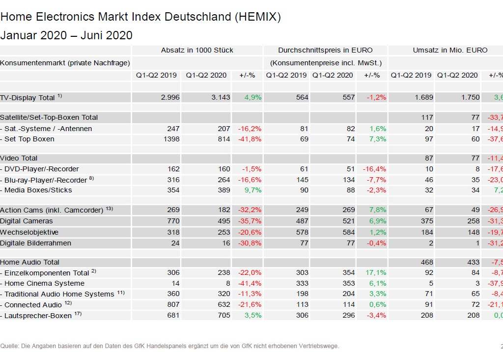 Der Markt für Home Electronics-Produkte (HE), dargestellt im HEMIX, liegt im ersten Halbjahr 2020 – verglichen mit dem Vorjahres-Zeitraum – mit 5,3% im Plus. In den Monaten Januar bis Juni 2020 wurde ein Umsatzvolumen von knapp 20,3 Mrd. EUR erreicht.