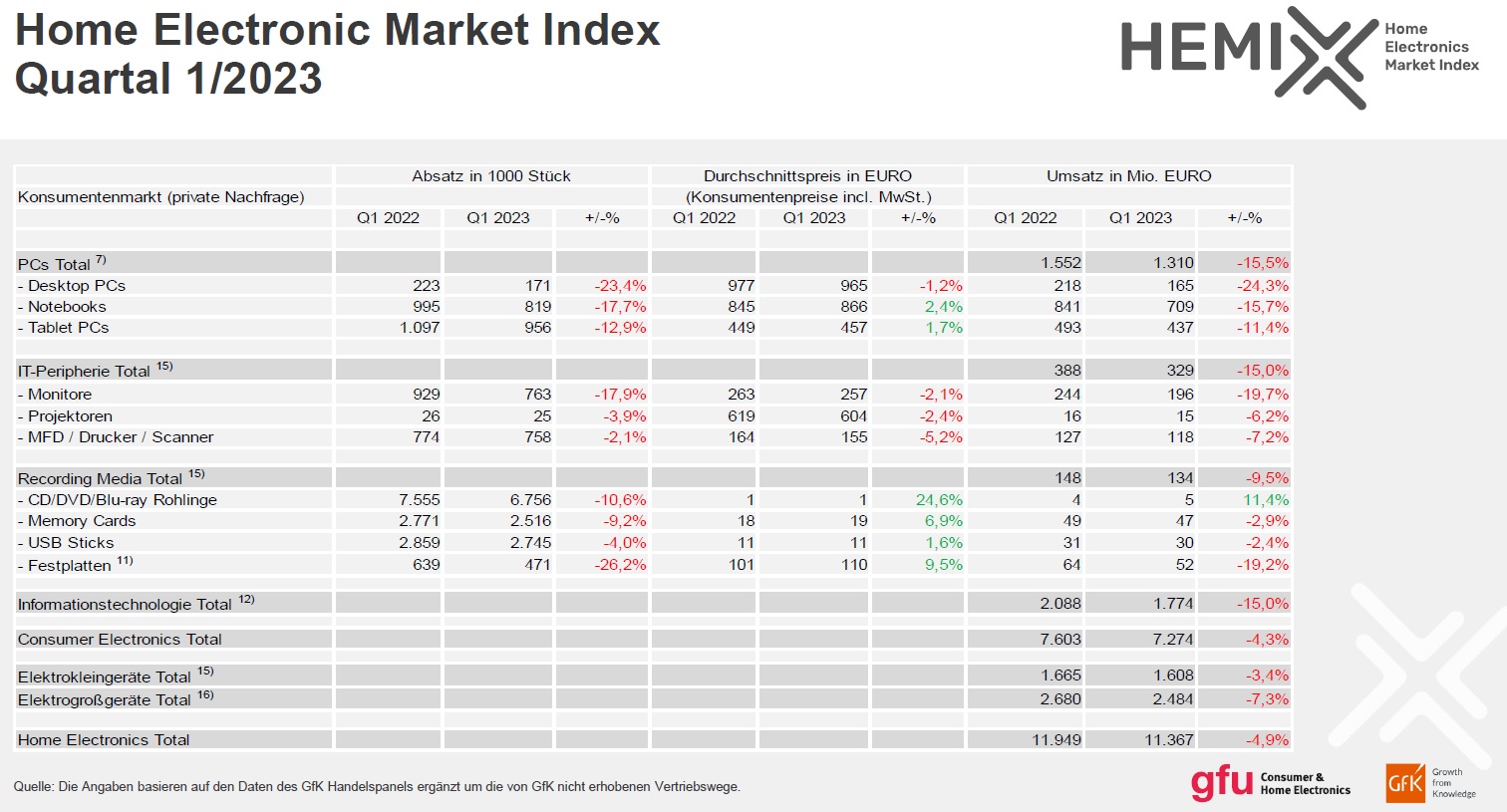 Die Marktzahlen der HE-Branche werden von der Branchenorganisation gfu sowie der GfK gemeinsam einheitlich für alle Marktteilnehmer in Form des offiziellen Home Electronics Market Index HEMIX erhoben und für jedes Quartal veröffentlicht. Der HEMIX zeigt auf Basis Menge und Wert die quartalsweise Marktentwicklung in Deutschland auf. Der Home Electronics-Markt ist dabei fest und einheitlich definiert als die Summe der Verkäufe in Deutschland an private Konsumenten.