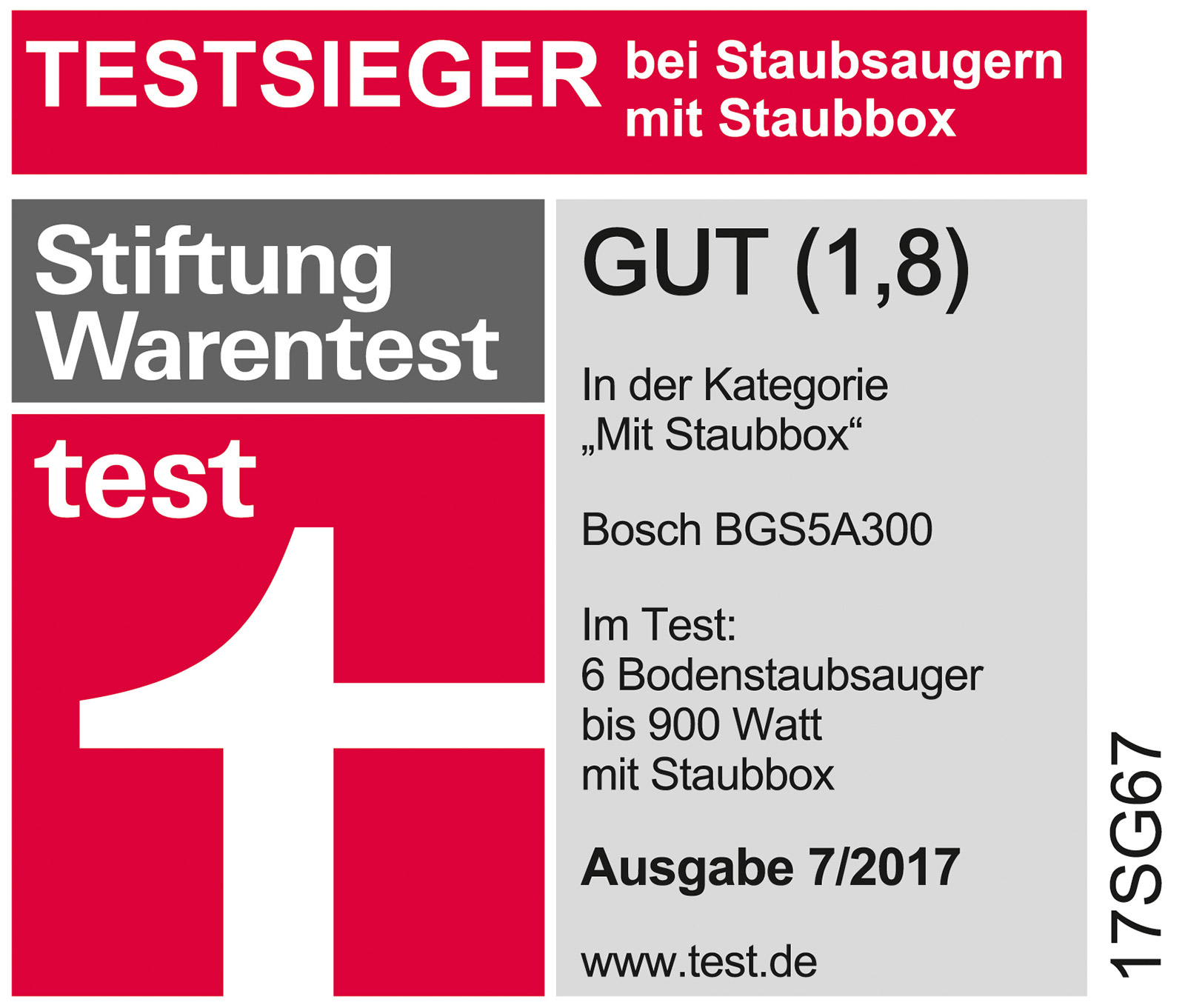 Mit der Gesamtnote 1,8 (Gut) in der Kategorie der beutellosen Geräte sichert sich der Bosch Relaxx’x ProSilence BGS5A300 Platz 1. Der Relaxx’x punktet als Multitalent und setzt sich in vielen Bereichen ab: Dank seiner guten Staubaufnahme und SmartSensor Control Technologie wird der Staubsauger mit der Bestnote 1,7 in dieser Kategorie ausgezeichnet. In Sachen Umwelteigenschaften, die neben dem Staubrückhaltevermögen auch die Punkte Geräusch und Stromverbrauch umfassen, schafft es der Testsieger sogar zu einem „sehr gut“ (Note: 0,9). Aufschlussreich dabei: Kein anderer der getesteten Stausauger derselben Kategorie erhält ein Ergebnis unter 1,5.