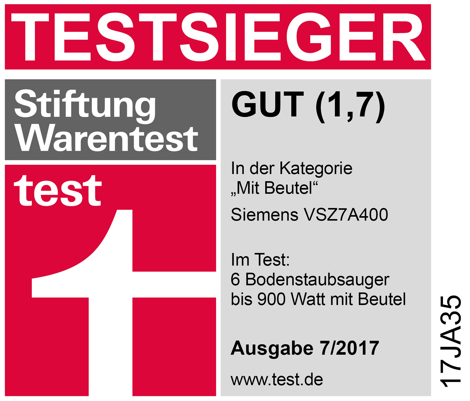 Ein Blick auf die Testsieger: Bereits in den vergangenen drei Jahren wurden Staubsauger von Siemens bei der StiWa als Testsieger ausgezeichnet. Mit der Gesamtnote 1,7 setzt sich auch 2017 der Siemens VSZ7A400 in der „test“-Ausgabe 07/2017 gegen die Konkurrenz der Beutellsauger durch. Insbesondere die Punkte Saugen und Handhabung erwähnen die Tester besonders lobend: Während die Staubaufnahme auf Teppich- sowie Hartböden als „gut“ bewertet wurde, erzielt die Saugleistung in Ritzen sogar „sehr gute“ Ergebnisse. Auch bei den Umwelteigenschaften lieferte der VSZ7A400 mit der Note 1,1 Spitzenwerte. Dieser Punkt setzt sich u.a. aus den Faktoren Staubrückhaltevermögen, Geräusch auf Teppichböden sowie Stromverbrauch zusammen, die alle ein „++“ erhielten – gleichzusetzen mit einem „sehr gut“.
