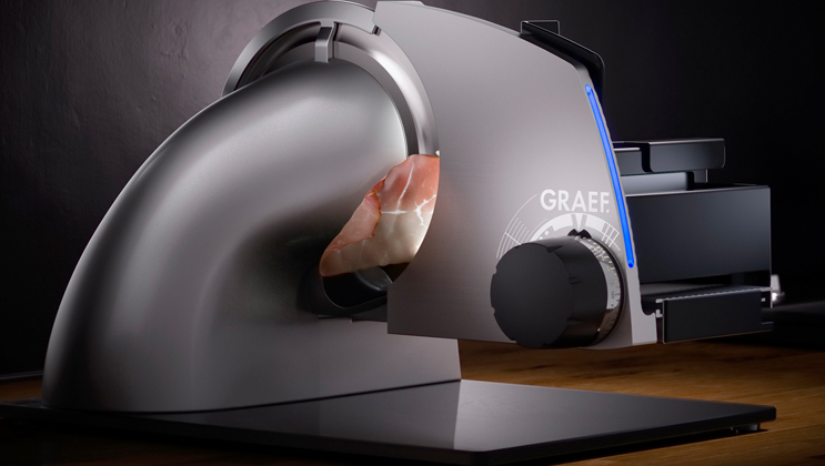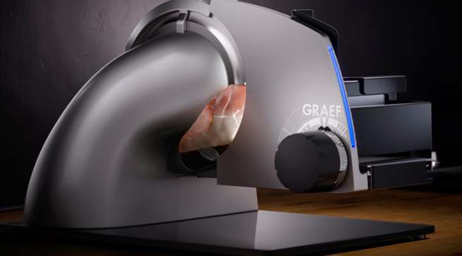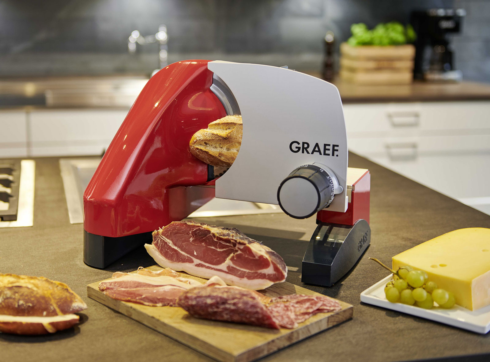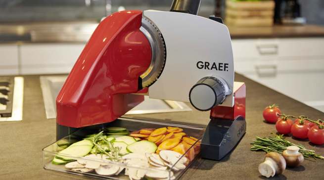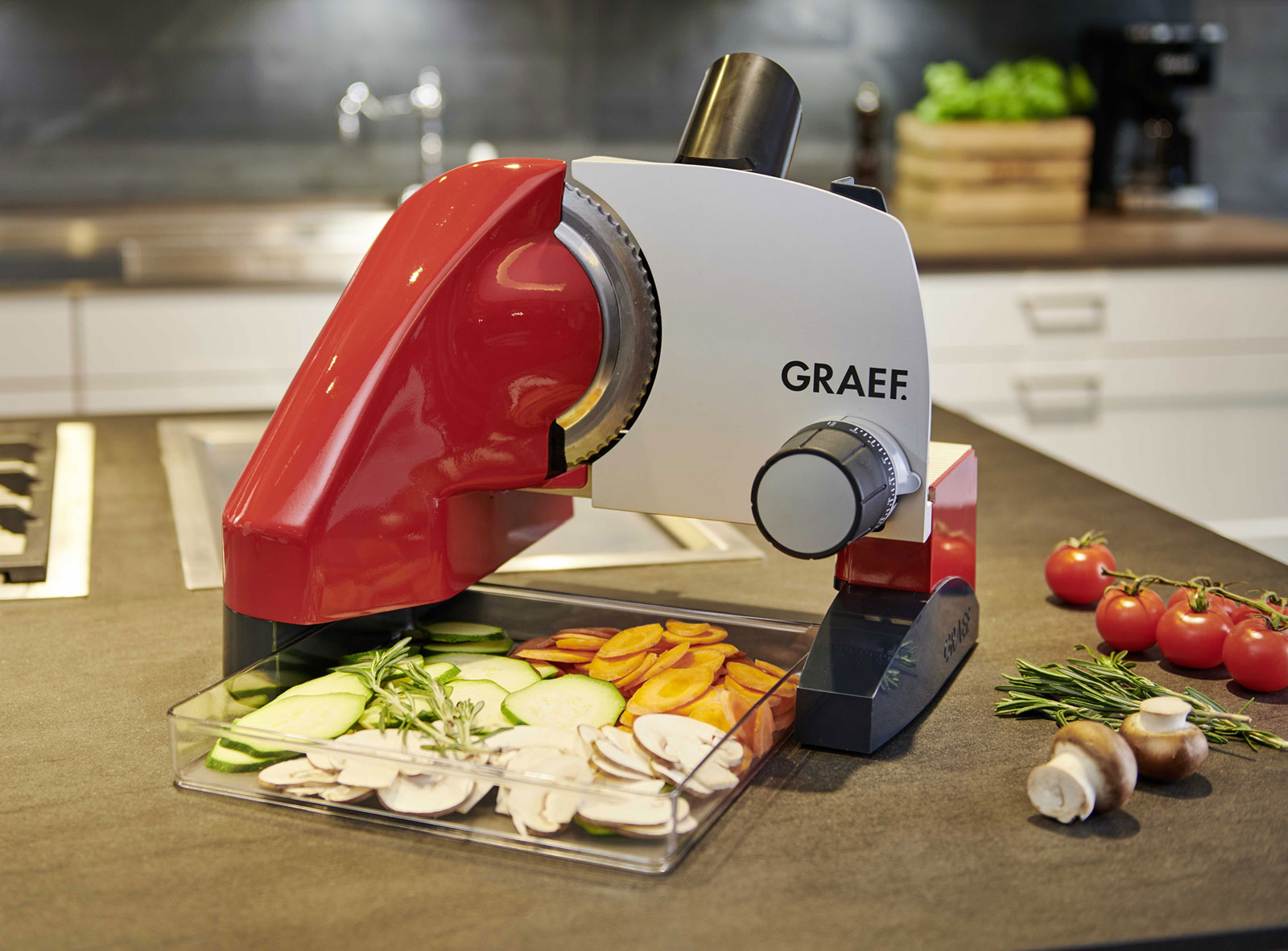 Natürlich können verschiedene Küchenmesser beim Schneiden behilflich sein. Eine komfortablere und schnellere Alternative sind praktische Allesschneider – beispielsweise der Allrounder des Familienunternehmens Graef, die SKS 500. Unermüdlich und dabei flüsterleise schneidet sich das vielseitige Multitalent durch sämtliches Schnittgut, dass ihm während des Familienalltags auf den Schlitten gelegt wird. Die hauchzart geschnittenen Lebensmittel – von Obst und Gemüse über Wurst und Käse bis hin zu angefrorenem oder gekochtem Fleisch – erfreuen Genießer nicht nur geschmacklich, sondern auch optisch. Eben für 100% Genuss, den ganzen Tag.