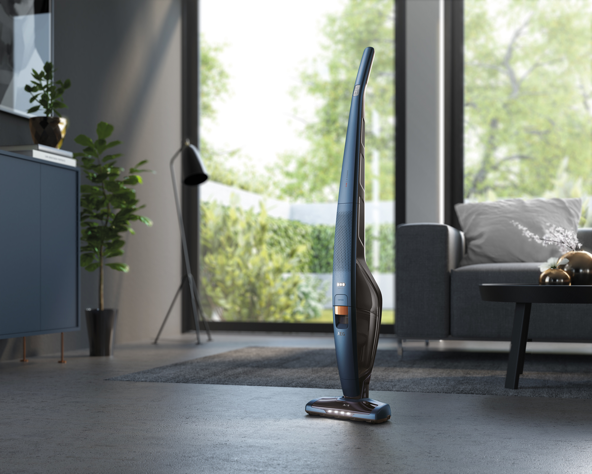 Der leistungsstärkste kabellose Handstaubsauger von AEG erweist sich zudem dank der um 180 Grad drehbaren Bodendüse als äußerst beweglich und kann selbst Tisch- und Stuhlbeine bequem umsaugen. Dabei bringen vier LED-Frontleuchten Licht ins Dunkel. Die patentierte BrushRollClean-Technologie zur Selbstreinigung der Bürstenrolle per Pedaldruck ist ein weiterer Pluspunkt. Dass er frei im Raum abgestellt werden kann, ist zudem sehr praktisch bei kurzen Saugpausen.
