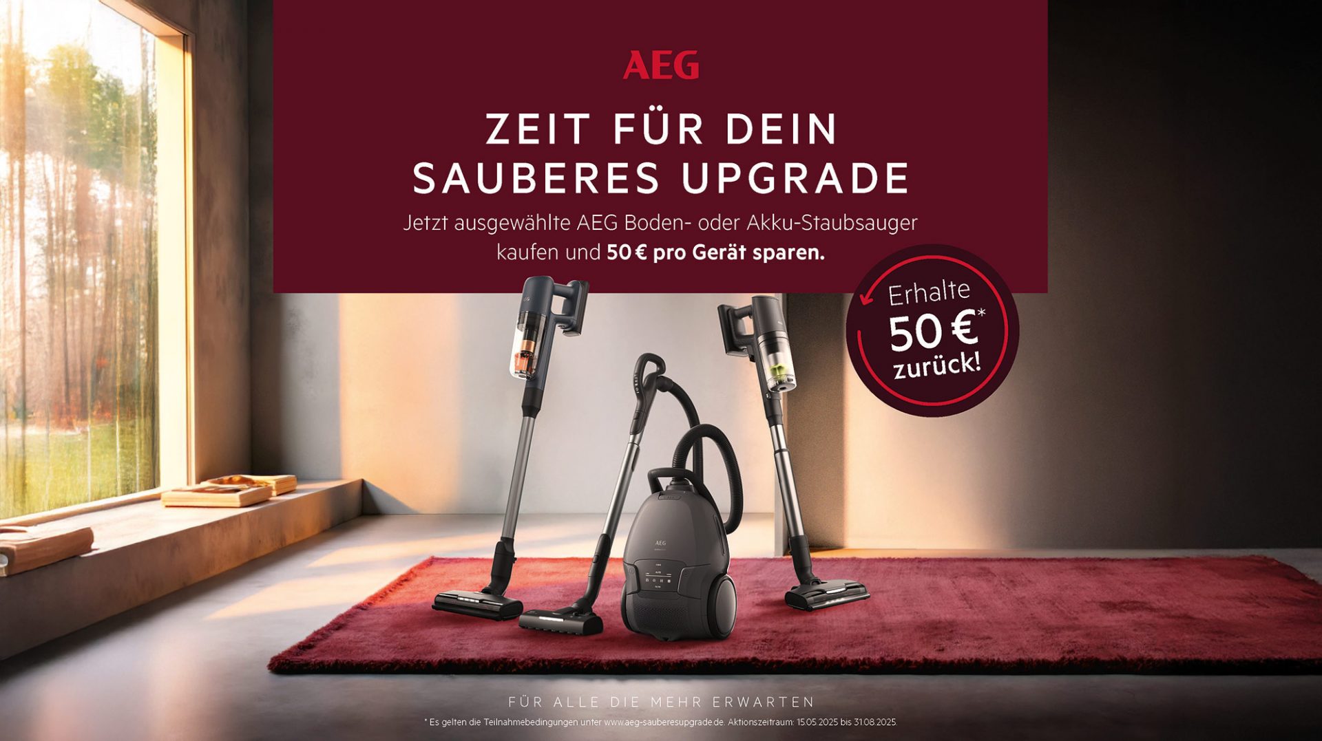 AEG startet unter dem Motto „Zeit für dein sauberes Upgrade“ eine neue Cashback-Aktion zur Unterstützung des stationären Fachhandels. Vom 15. Mai bis 31. August 2025 erhalten Verbraucher in Deutschland und Österreich beim Kauf ausgewählter Akku- und Bodenstaubsauger 50 Euro zurück.