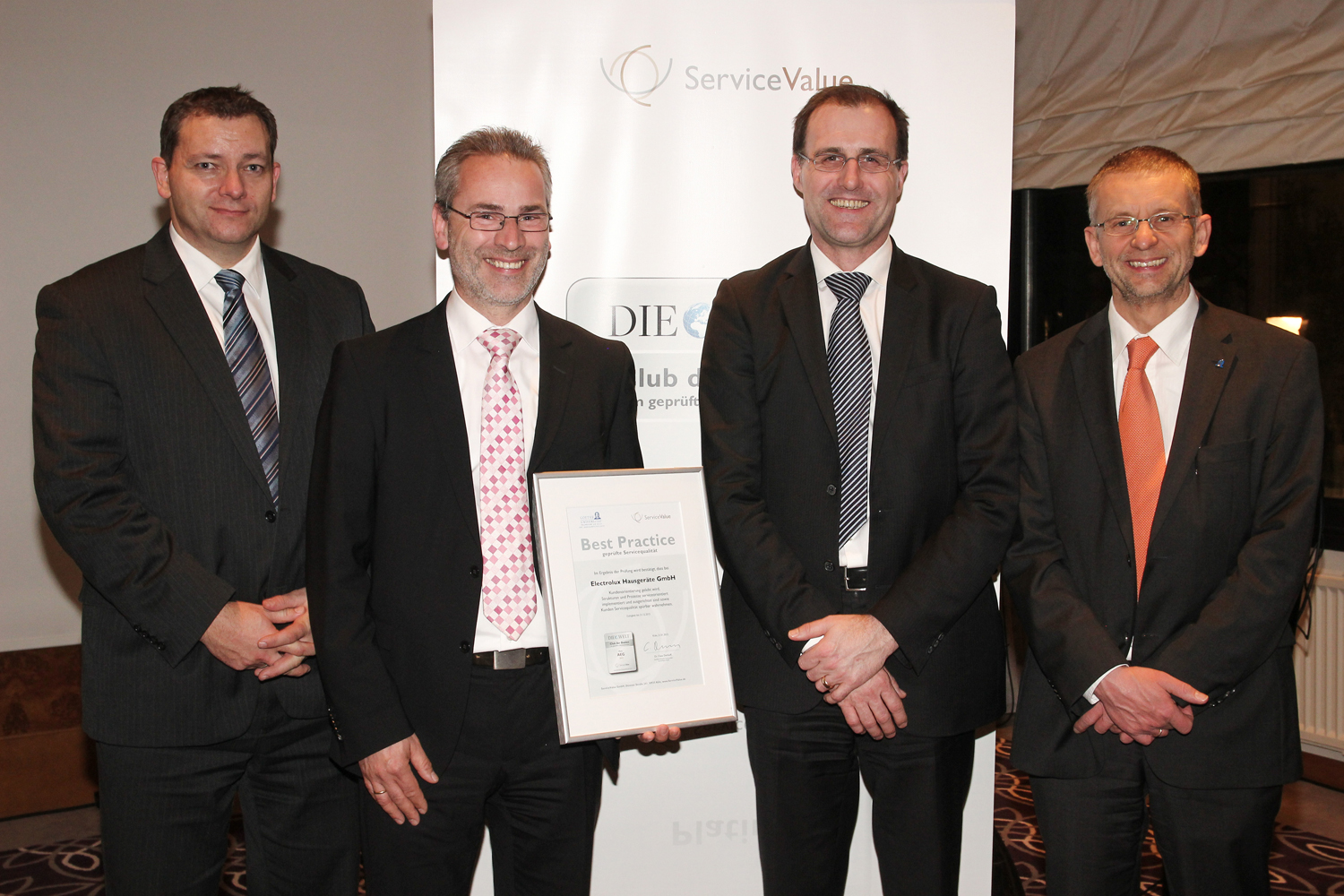 Ausgezeichnet als Service-Champion und Mitglied im Club der Besten 2015: Dr. Claus Dethloff, ServiceValue GmbH, Ralf Hansel, Geschäftsführer Electrolux Hausgeräte GmbH Deutschland und Österreich, Andreas Viefhaus, Electrolux Vice President Consumer Care and Aftermarket Sales EMEA, Prof. Dr. Rolf van Dick, Goethe Universität Frankfurt am Main (v.l.n.r.).
