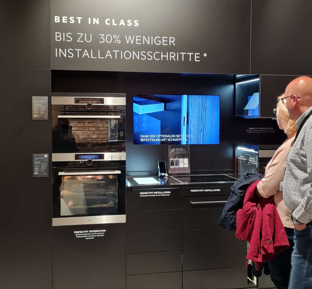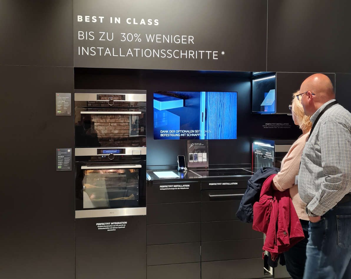 Neben der Alltagserleichterung für die Konsumenten stand auch die aktive Unterstützung der Handelspartner im Fokus. Ganz im Sinne „Premiummarke, Premiumauftritt“ setzt AEG am Point of Sale an und wertet die Ausstellungen vor Ort mit starken, hochwertigen Bildwelten und Kernbotschaften aus der Markenkampagne „Für alle die mehr erwarten“ auf.