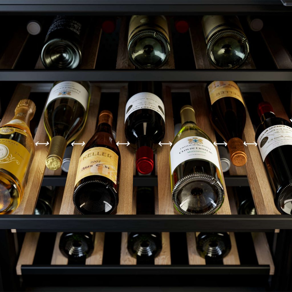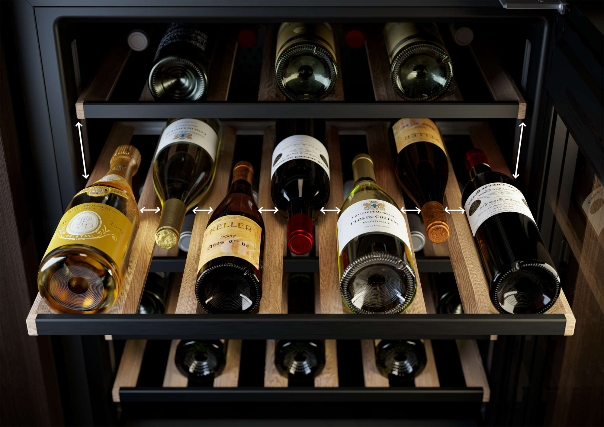 Ein ausgeklügeltes Regalsystem ermöglicht die Lagerung aller 0,75 Liter-Flaschenformen – egal ob Chardonnay, Champagner, Bordeaux oder Riesling – und ist damit der perfekte Allrounder. Der AEG 8000 Perfect Shelving ist in verschiedenen Größen und Bauweisen als Einbauschrank erhältlich und fügt sich so nahtlos in die jeweilige Wohnumgebung ein.