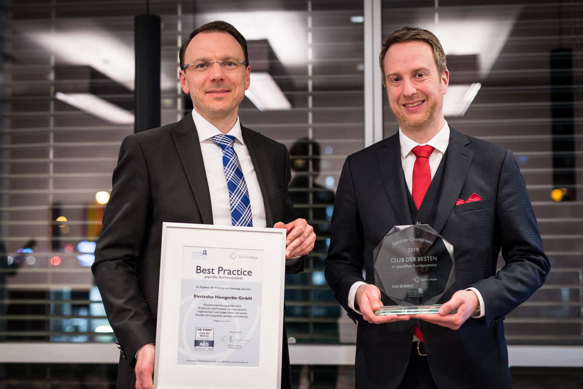 AEG hat erneut im Service-Ranking des Analyseinstituts Service Value in Kooperation mit der Tageszeitung „Die Welt“ und der Goethe-Universität Frankfurt überzeugt und sicherte sich erneut die Platin-Auszeichnung sowie die Aufnahme in den „Club der Besten“. Für die jährlich vergebene Auszeichnung wurden rund 1,5 Millionen Kundenurteile zu mehr als 3000 Unternehmen und über 300 Branchen ausgewertet.