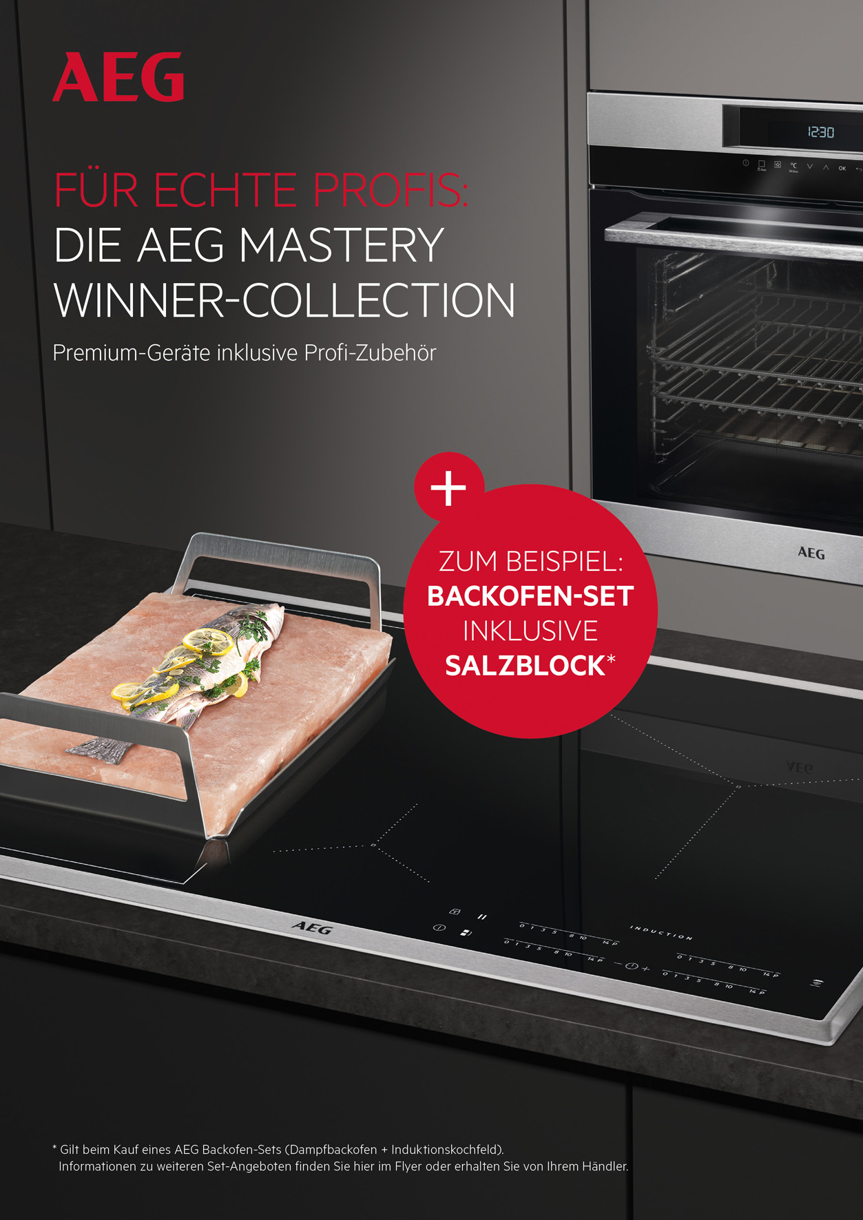 Zur Aktion gehören die Backofensets der Mastery Winner Collection. Das Set besteht aus den Multi-Dampfgarern SteamPro oder SteamCrisp und dem MaxiSense Induktionskochfeld. Komplettiert wird das Set im Aktionszeitraum vom AEG Himalaya-SaltBlock, der das natürliche Aroma von Speisen intensiviert und als extravagante Servierplatte genutzt werden kann, sowie dem passenden FlexiRunners Vollauszug mit Teleskopschienen.