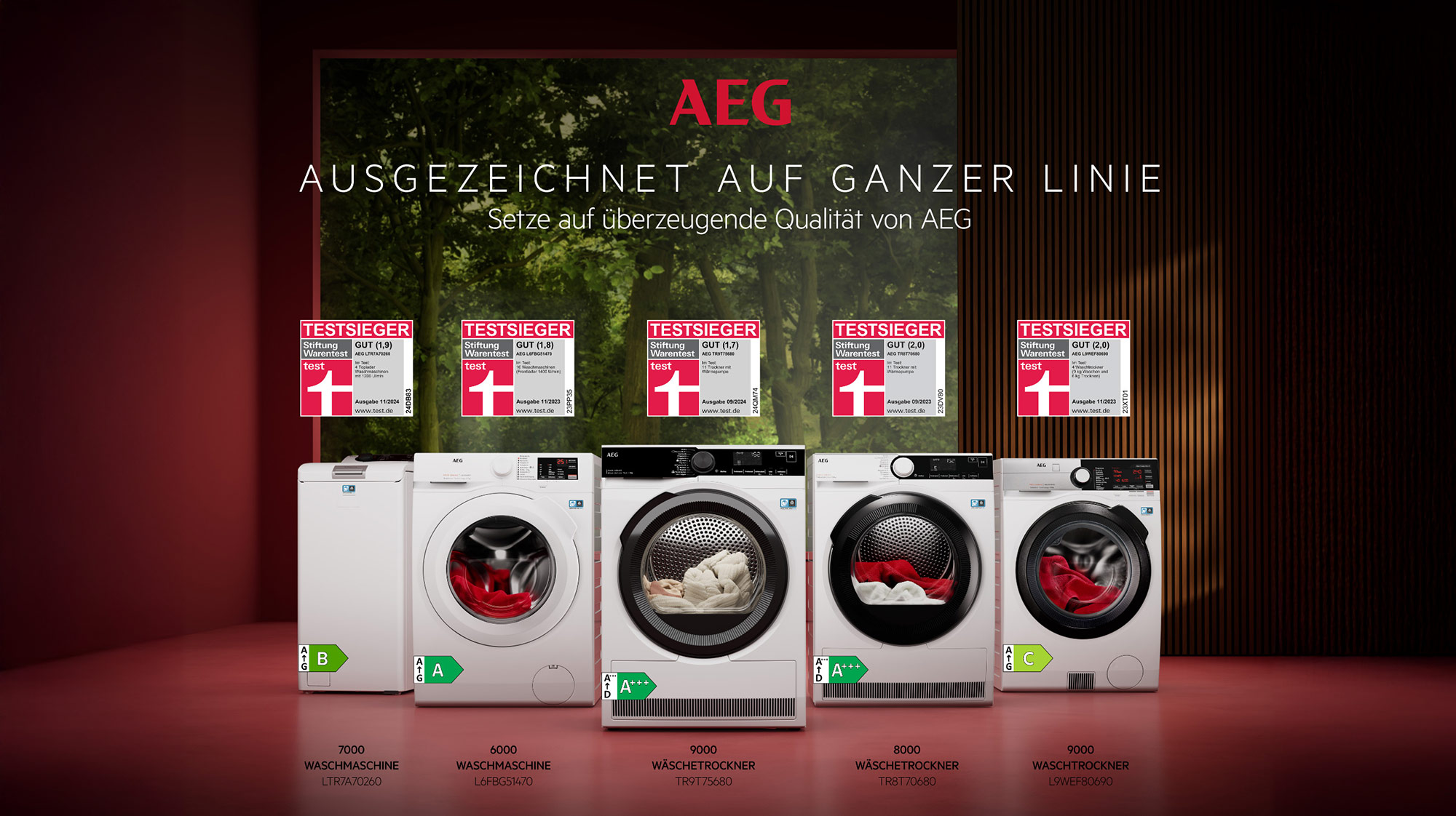 Der AEG 7000 Toplader reiht sich in die Riege von vier weiteren Stiftung Warentest-Testsiegern ein: dem AEG 9000 Wäschetrockner AbsoluteCare Plus TR9T75680, den die Stiftung Warentest als „neuen Goldstandard für Wäschetrockner“ bezeichnete. Der AEG 9000 AbsoluteCare Plus wurde auf der diesjährigen IFA in Berlin neben den Stiftung Warentest-Gewinnern von 2023 vorgestellt: dem AEG 8000 AbsoluteCare TR8T70680 Wäschetrockner, dem AEG 9000 SensiDry L9WEF80690 Waschtrockner und der 6000 ProSense L6FBG51470 Waschmaschine.