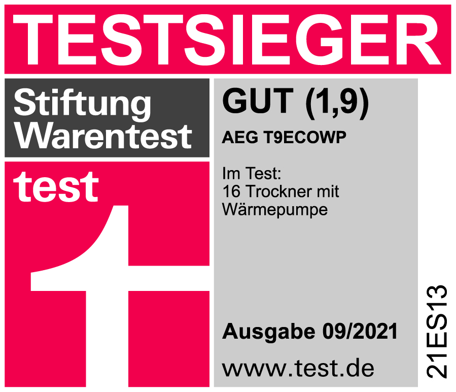 Mit der Gesamtnote „gut“ (1,9) landete der AEG Trockner Lavatherm T9ECOWP ganz oben auf dem Siegertreppchen. Er überzeugte in allen Kategorien mit sehr gutem oder gutem Ergebnis und ist im Bereich Trocknen mit Abstand der Beste im Test.