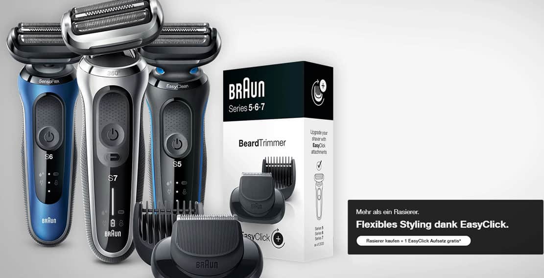 Wer bis zum 30. September 2022 einen Braun Rasierer Series 7, Series 6 oder Series 5 sowie einen EasyClick-Aufsatz beim Händler kauft, bekommt den Verkaufspreis vom Aufsatz erstattet.
