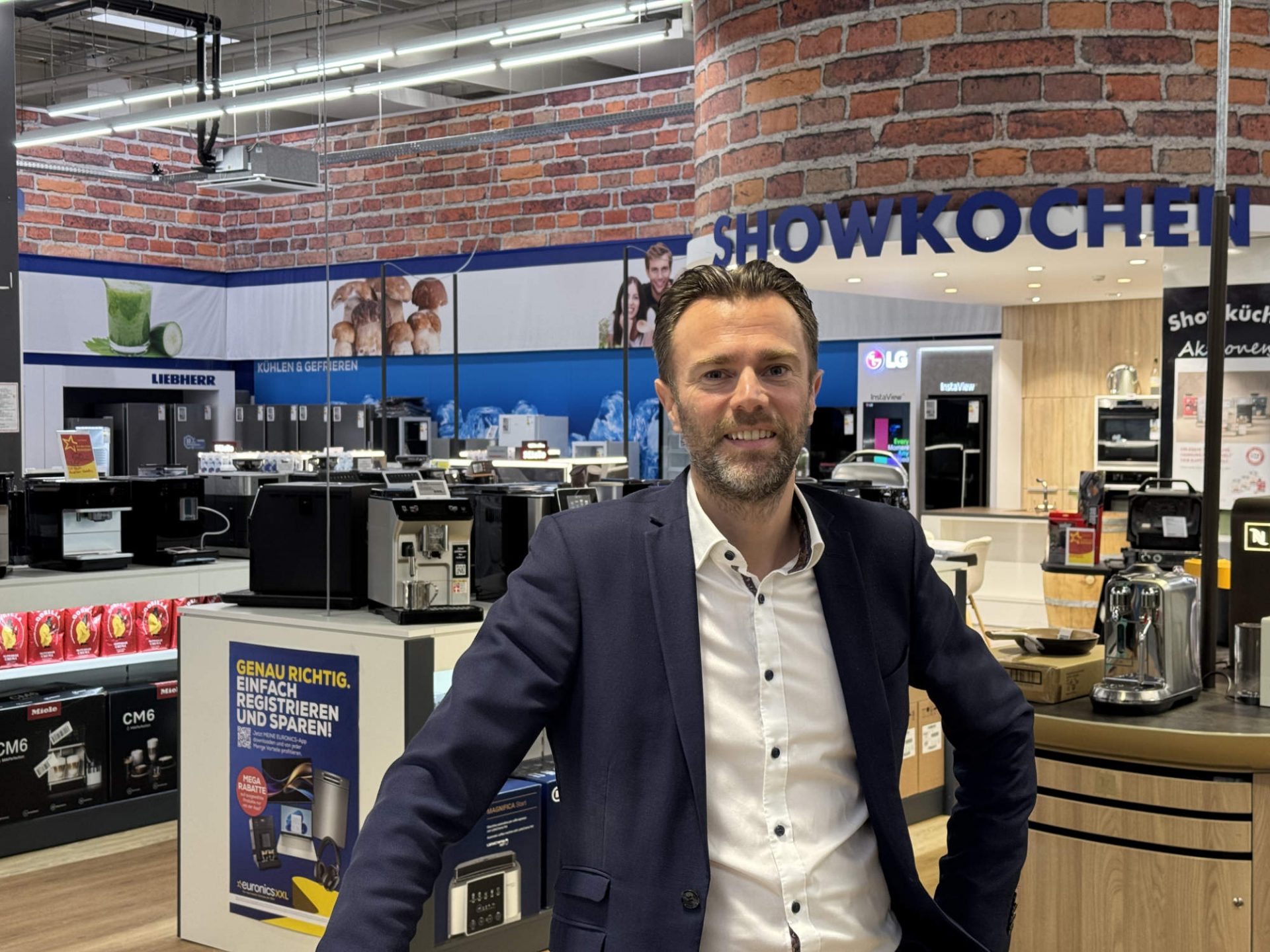 Daniel Kirberg, Geschäftsführer und Inhaber von Euronics XXL Bodensee und der Mega Company in Tettnang, im Interview mit infoboard.de. Kirberg betreibt zehn Standorte mit rund 320 Mitarbeitern und einer Gesamtverkaufsfläche von 18.200 Quadratmetern, neben Tettnang auch in Ravensburg, Biberach, Lindau, Memmingen, Neu-Ulm, Tuttlingen, Rottweil, Balingen und Villingen-Schwenningen. Foto: Euronics