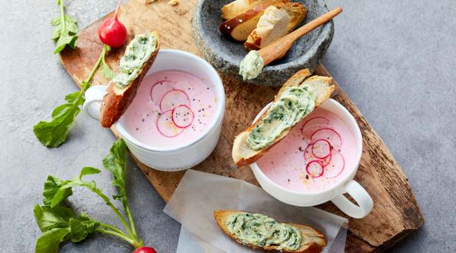 - Butter in der Küchenmaschine schaumig aufschlagen, dabei salzen und das gehackte Radieschengrün hinzufügen. So lange weiterschlagen, bis sich die Butter leicht grün färbt. Butter in ein Schälchen füllen und kalt stellen.