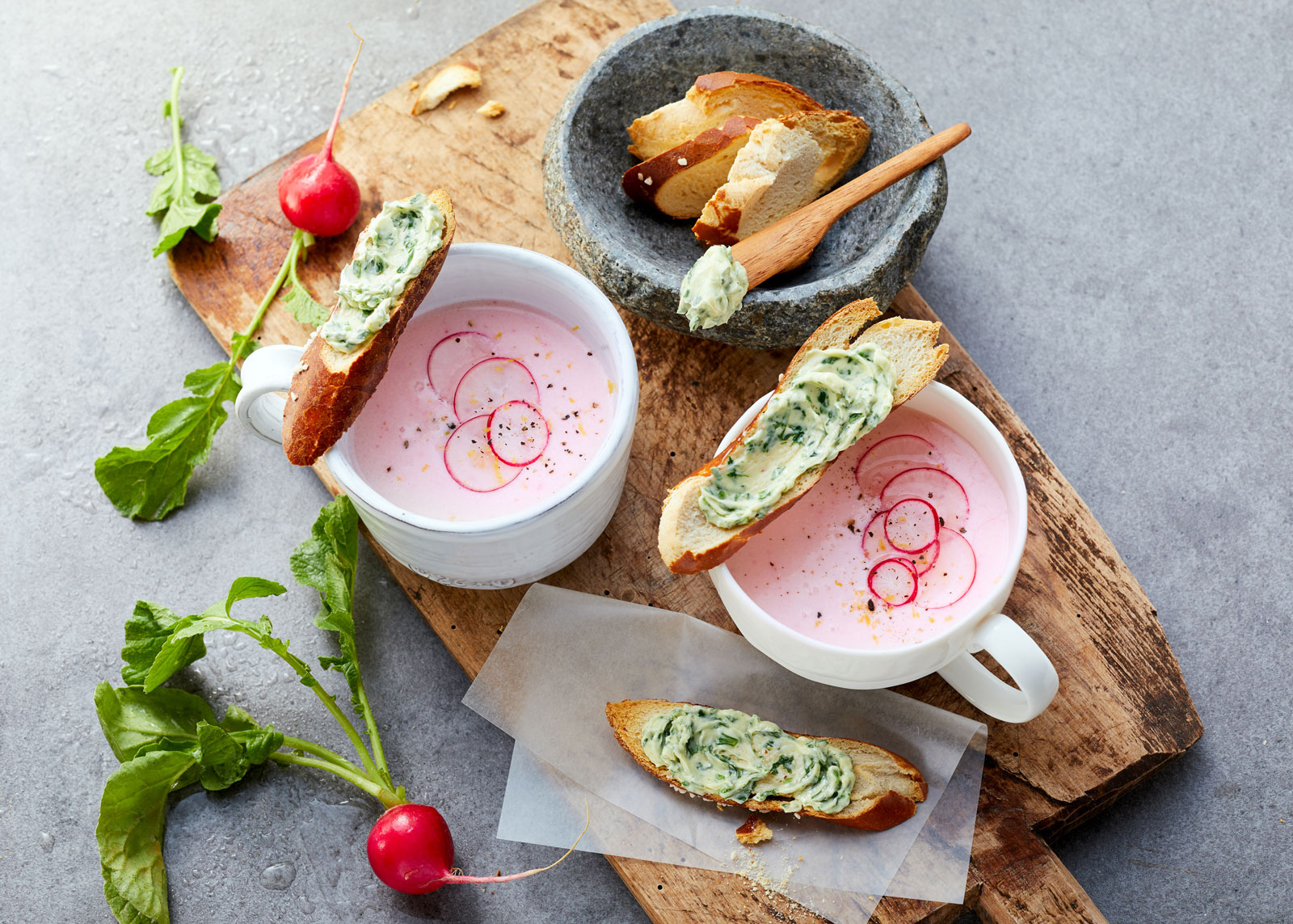 - Zum Servieren die Suppe kurz aufmixen und in Cappuccinotassen gießen. Scheiben der Laugenstange mit Butter bestreichen und dazu reichen.