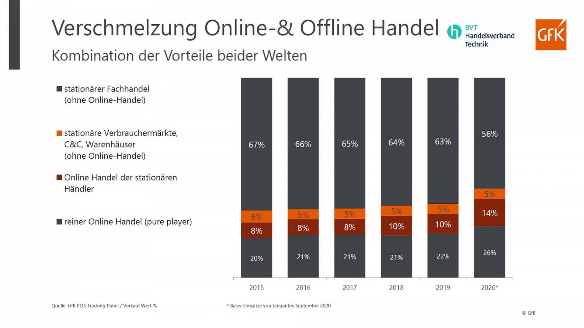 Auch nach Beendigung der Geschäftsschließungen haben viele Kunden ihr Einkaufsverhalten der Situation in den öffentlichen Verkehrsmitteln und Innenstädten sowie dem eigenen Sicherheitsempfinden angepasst: Der Online-Anteil am Gesamtmarkt mit Technik ist sprunghaft gestiegen.