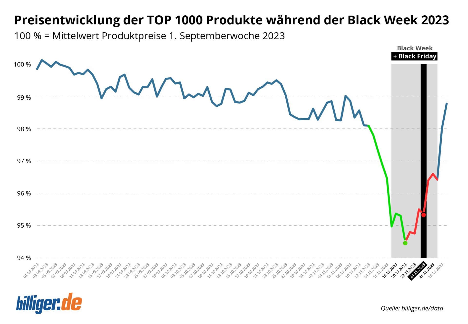 Mit dem Black Friday erlebt die Angebots- und Rabattwoche Black Week alljährlich ihren vermeintlichen Höhepunkt. In den Tagen davor locken der Einzel- und vor allem der Onlinehandel bereits mit massiven Rabattaktionen. Die Preisvergleichsexperten von billiger.de haben im Nachgang zum Black Friday am 24. November die Preisentwicklungen der Top 1.000 Produkte während der Black Week analysiert. Die Analyse zeigt: Am Black Friday gab es für die Kunden nicht die besten Preise.