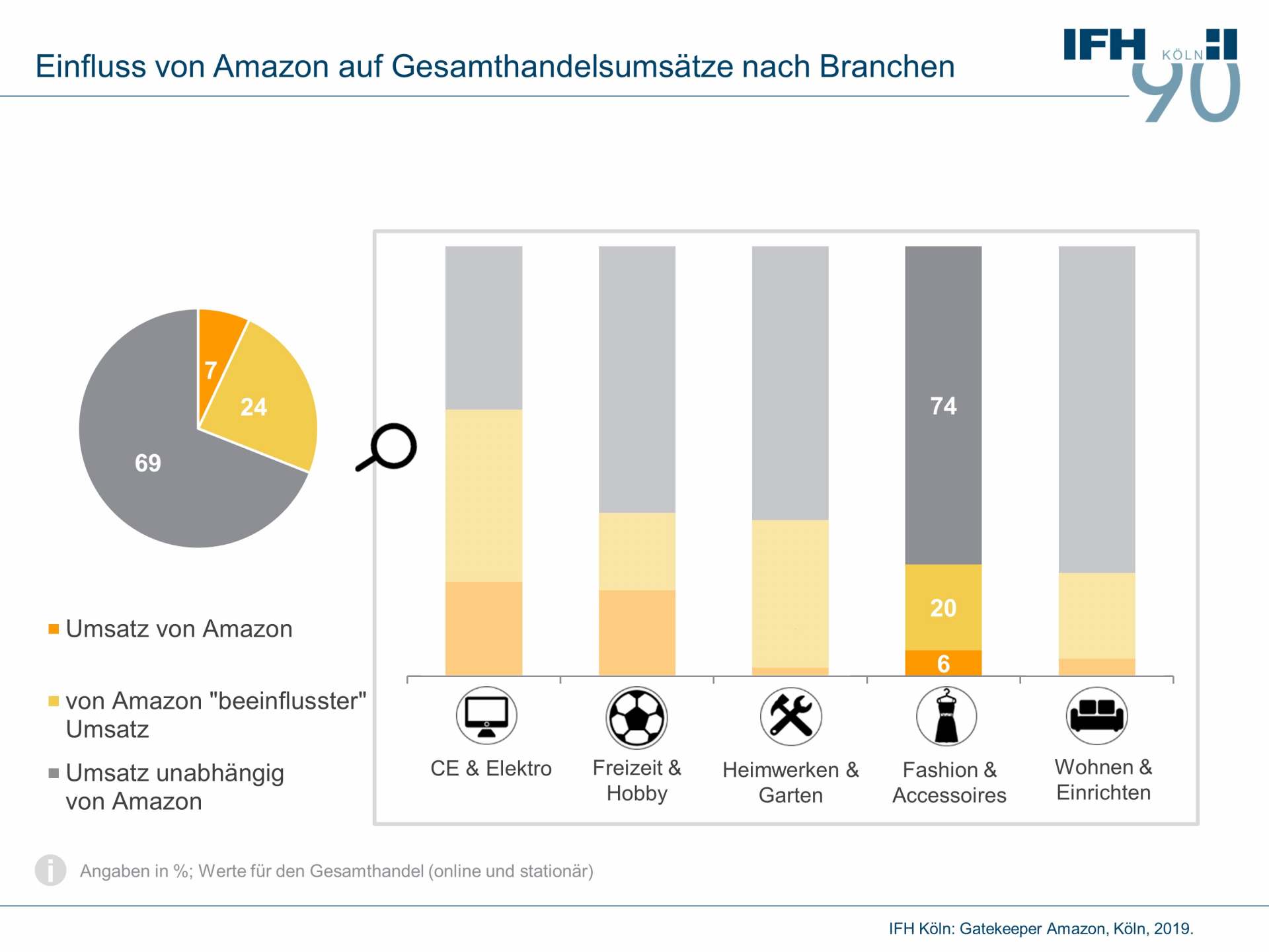 Analysen zur deutschen Handelslandschaft kommen um Amazon nicht mehr herum. Warum das so ist, verdeutlicht die neue IFH-Studie „Gatekeeper Amazon – Vom Suchen und Finden des eigenen Erfolgswegs“ eindrücklich. Wachstumsimpulse generiert Amazon aktuell vor allem aus dem Marktplatzgeschäft, so ist das Eigenhandelsgeschäft 2018 nur um 2,2 Prozent gewachsen. Doch Amazon ist längst kein reines Onlinephänomen mehr. Die Studie zeigt detailliert auf, wie stark der Einfluss des Onlinegiganten auf die gesamte deutsche Handelslandschaft ist. Und dieser Einfluss wächst massiv. Rund 31 Prozent aller Umsätze im Nonfood-Bereich – egal ob online oder stationär – sind schon heute von Amazon abhängig. Ganze sieben Prozent sind Umsatz des Handelsriesen selbst, die übrigen 24 Prozent entfallen auf Umsätze, die direkt von Amazon beeinflusst werden – zum Beispiel durch die Informationssuche auf der Onlineplattform. Selbst in der vermeintlich amazon-schwachen Fashion-Branche ist rund ein Viertel des Marktvolumens von Amazon abhängig. In anderen Branchen fällt dieser Anteil deutlich höher aus.