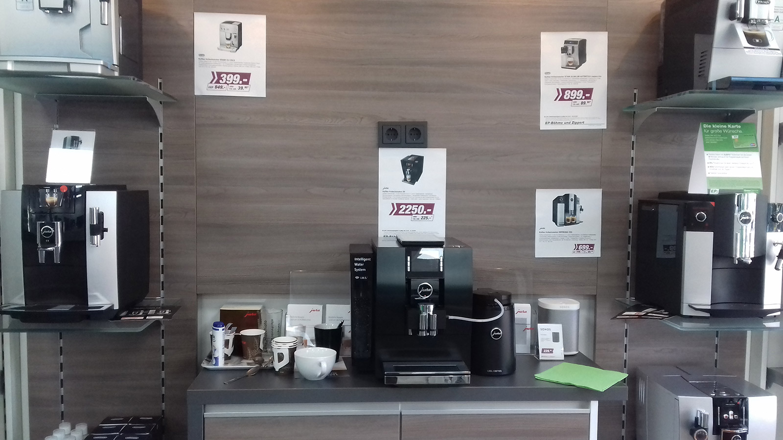 Bestes Beispiel dafür ist die neue Kaffee-Bar mit Genuss-Verstärkern von Jura im Mittelpunkt und De’Longhi zur Abrundung des Sortiments. „Kaum ein anderes Thema ist so individuell wie der Kaffeegenuss. Bei uns können sich die Kunden mit den unterschiedlichen Zubereitungsvarianten vertraut machen und natürlich auch probieren“, so Böhme. Und sollte ein Gerät in einer bestimmten Ausstattung und Farbe nicht vorhanden sein, wird der Kunde an das „Virtual Shelf“, die verlängerte Ladentheke, gebeten. „Kommt klasse an, wird gerne genutzt und hat optimale Filterkriterien“, so die Erfahrung der beiden Inhaber nach den ersten drei Wochen seit der Wiedereröffnung.