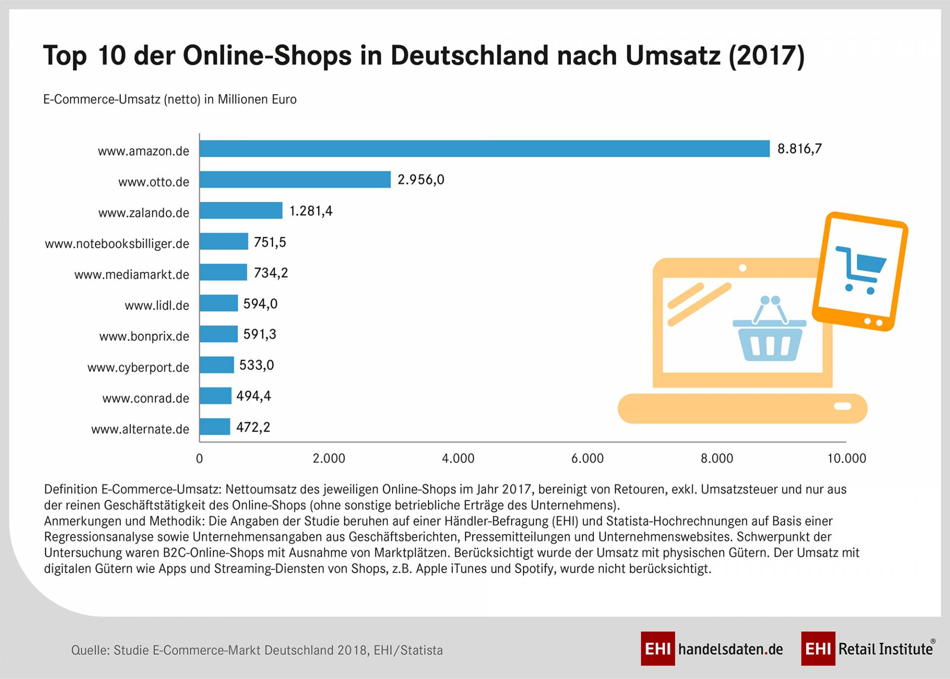 Die Angaben der Studie beruhen auf einer Händler-Befragung (EHI) und Statista-Hochrechnungen auf Basis einer Regressionsanalyse sowie Unternehmensangaben aus Geschäftsberichten, Pressemitteilungen und Unternehmenswebsites. Schwerpunkt der Untersuchung waren B2C-Online-Shops mit Ausnahme von Marktplätzen. Berücksichtigt wurde der Umsatz mit physischen Gütern. Der Umsatz mit digitalen Gütern wie Apps und Streaming-Diensten von Shops, z.B. Apple iTunes und Spotify, wurde nicht berücksichtigt.