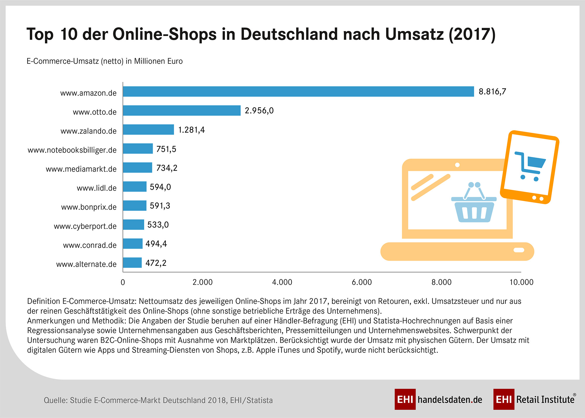 Die Angaben der Studie beruhen auf einer Händler-Befragung (EHI) und Statista-Hochrechnungen auf Basis einer Regressionsanalyse sowie Unternehmensangaben aus Geschäftsberichten, Pressemitteilungen und Unternehmenswebsites. Schwerpunkt der Untersuchung waren B2C-Online-Shops mit Ausnahme von Marktplätzen. Berücksichtigt wurde der Umsatz mit physischen Gütern. Der Umsatz mit digitalen Gütern wie Apps und Streaming-Diensten von Shops, z.B. Apple iTunes und Spotify, wurde nicht berücksichtigt.