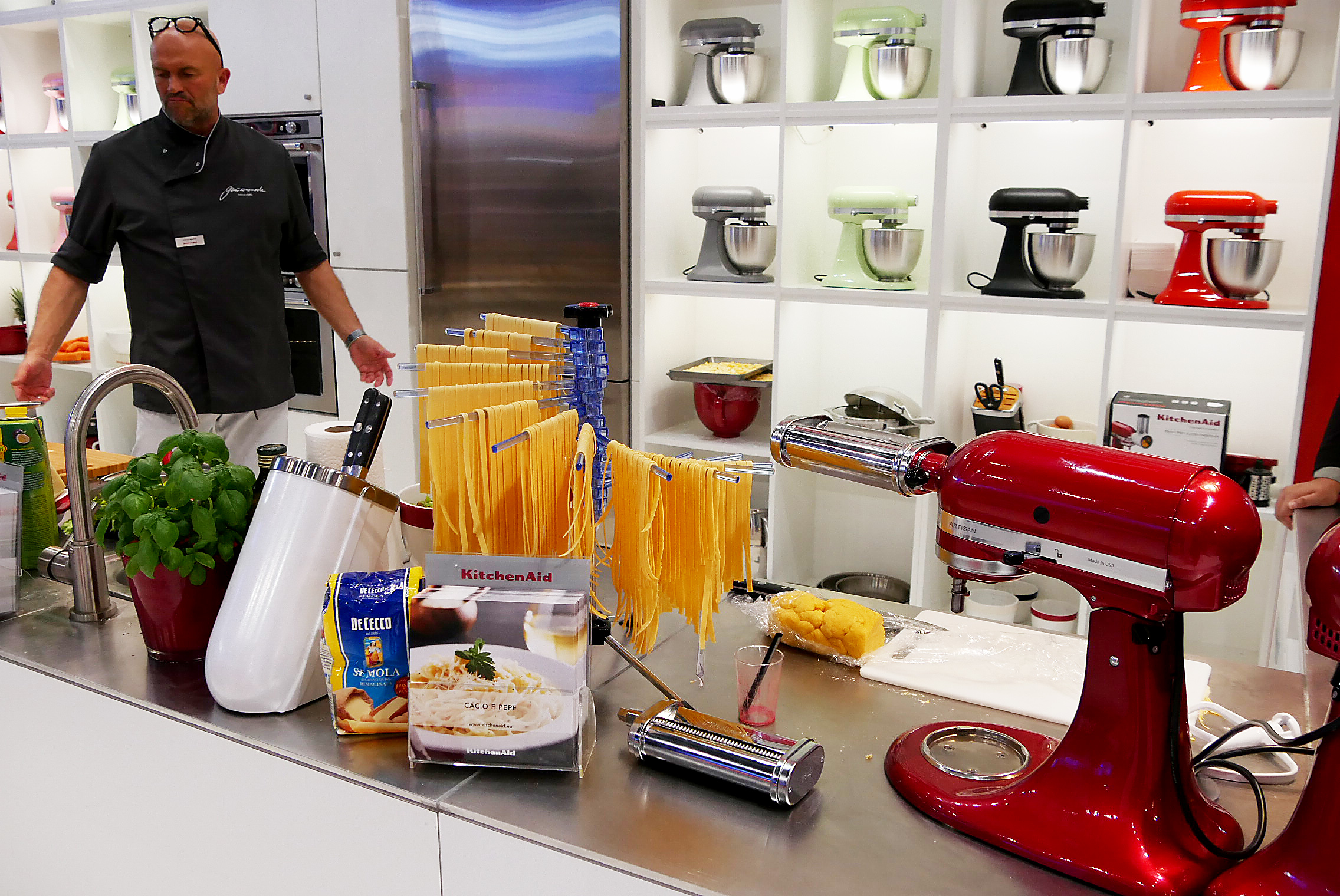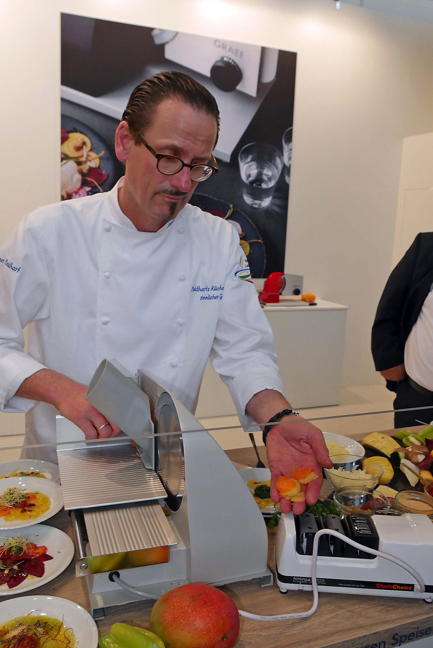 Wer mit Elektrokleingeräten für die Küche handelt, diese vertreibt oder herstellt, für den muss die Ambiente-Auflage 2017 einmal mehr ein Glückfall sein. Nirgendwo sonst, als in der schicken Halle 3 werden die kleinen, praktischen Küchenstars liebevoller und genüsslicher in Szene gesetzt. Geduftet hat es an jeder Ecke, gebrutzelt wurde beinahe auf jedem Stand – nur bei Graef bleib die Küche kalt. Die Sauerländer präsentierten ihre Sliced Kitchen, verarbeiteten von der gelben Zucchini bis zur violetten Kartoffel alles zu einem schwebeleichten Carpaccio mit lauter Geschmacksexplosionen auf der Zunge.