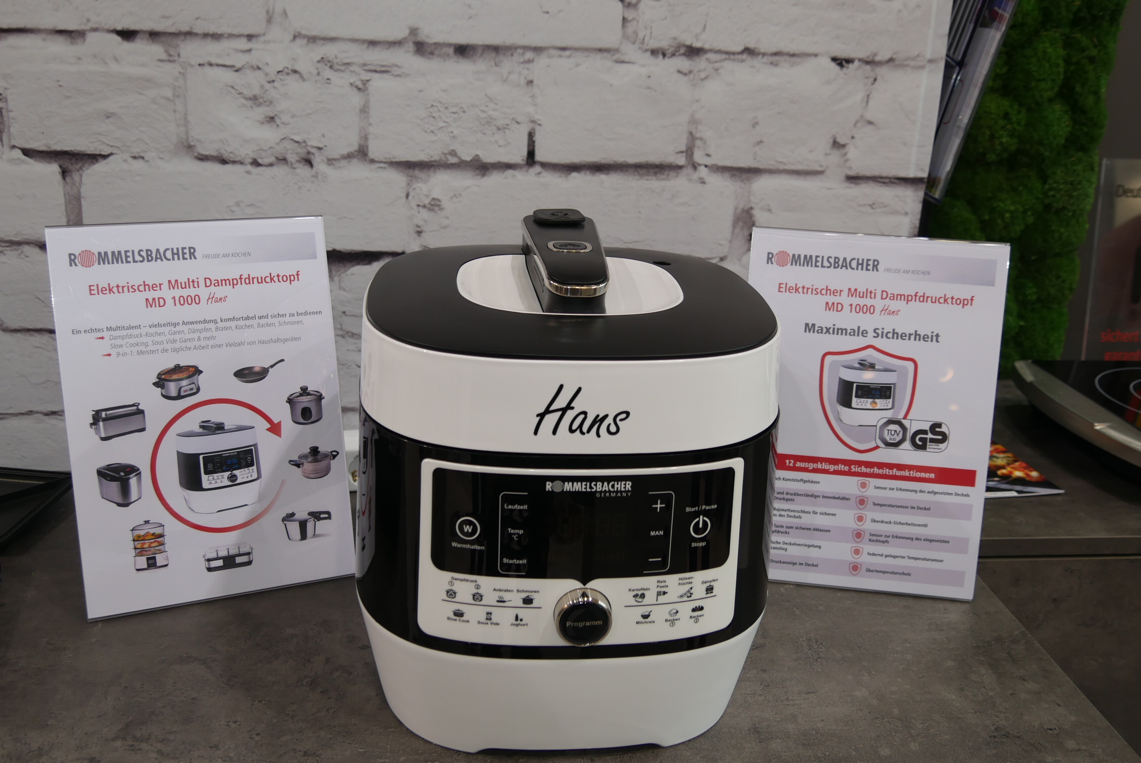 Küchenmaschinen gibt es wie Sand am „Ambiente“-Meer, die beiden von Ankarsrum und Carrera ragen aufgrund ihrer vielfältigen Funktionen und des Designs heraus, Formel-1 für die Küche eben. Ein Multitalent ist auch der elektrische Dampfdruckkochtopf „Hans“ (MD 1000) von Rommelsbacher. „Hans“ im Glück macht diverse Geräte überflüssig, beispielsweise Reiskocher, Joghurt-Bereiter oder Dampfgarer.