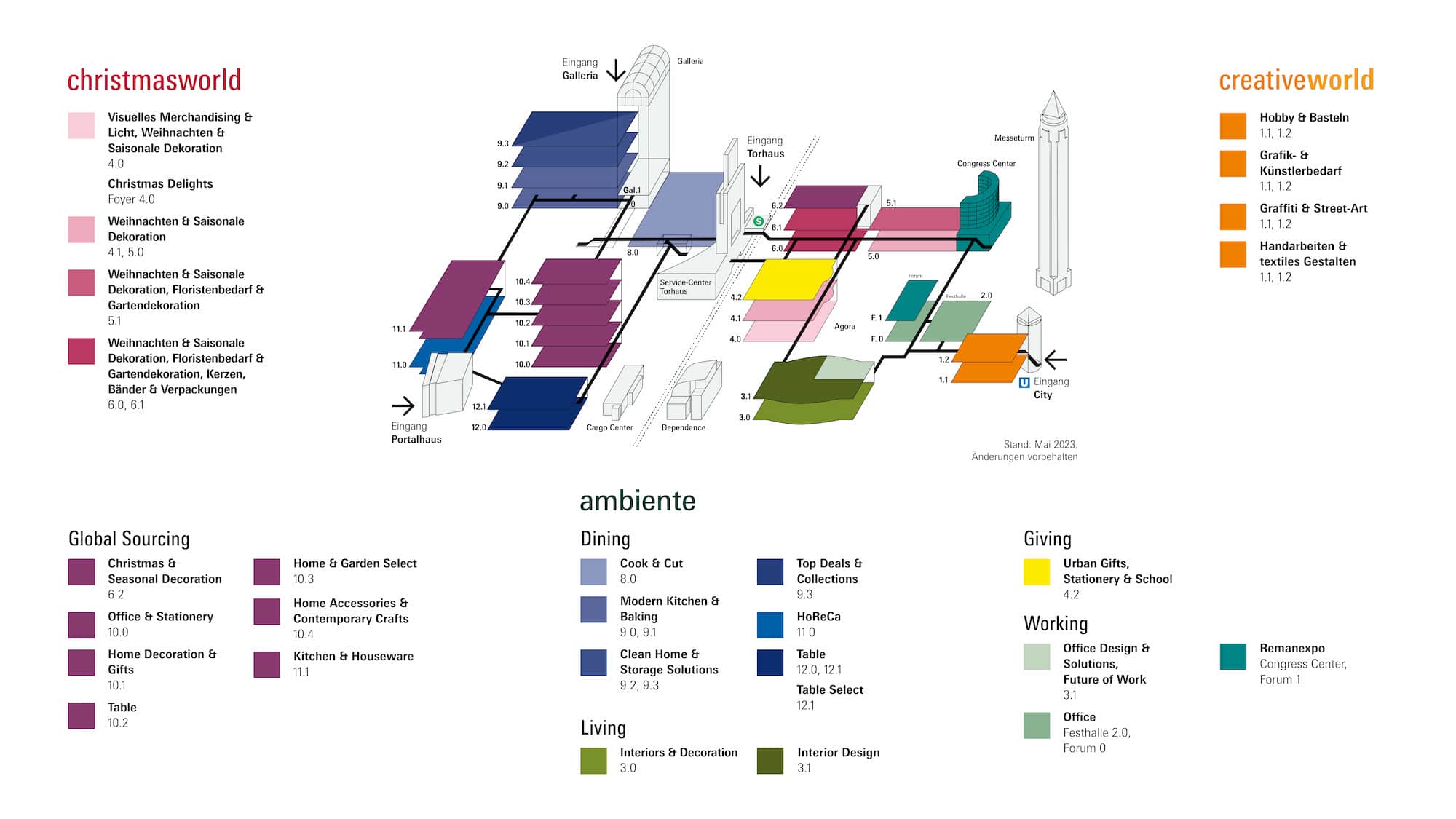 Der neue Hallenplan des Messegeländes in Frankfurt zur Ambiente, Christmasworld und Creativeworld 2024. Fotos: Messe Frankfurt.