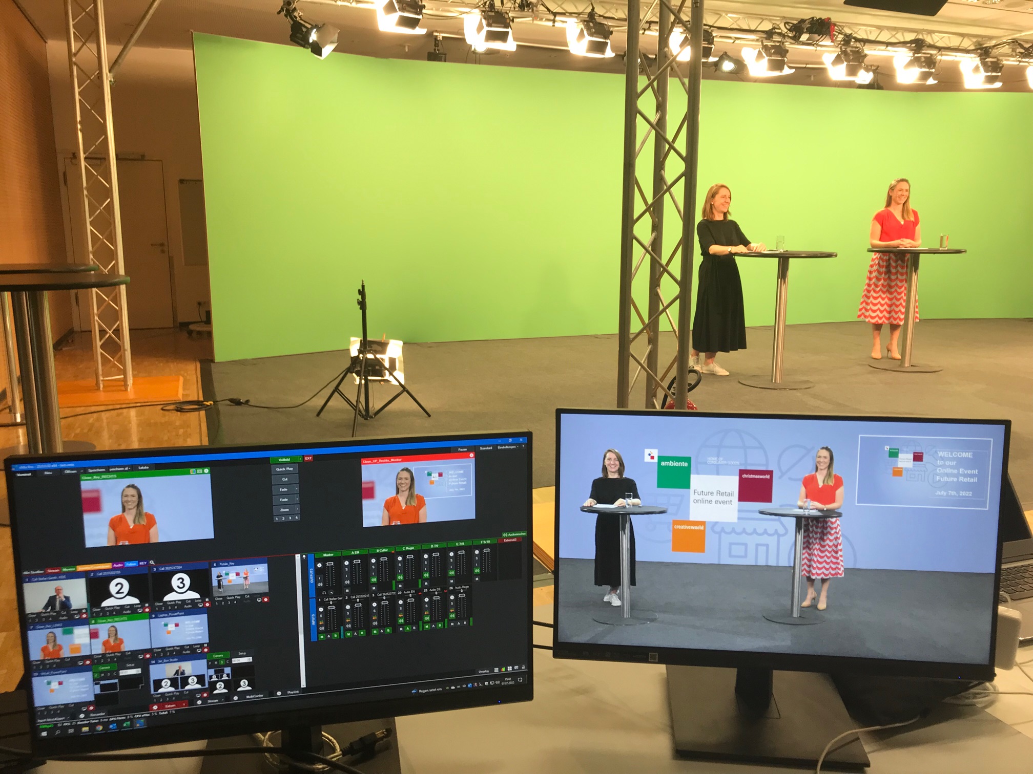 Marilyn Repp (rechts) vom Handelsverband Deutschland und Julia Uherek Bereichsleiterin Consumer Goods Fairs bei der Eröffnung des Online-Events Future Retail.
