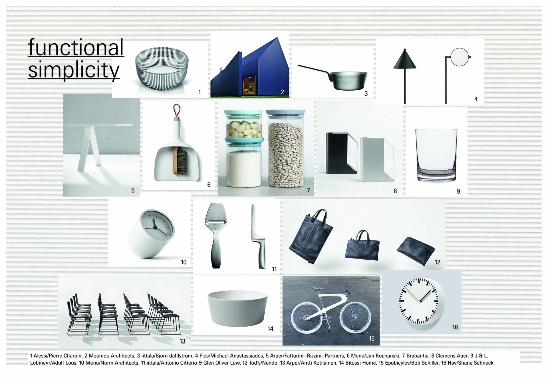 Functional simplicity setzt mit einer nahezu monochromen Farbpalette in Weiß und Grautönen auf maximale Funktionalität der Produkte. Ein reduziertes Design setzt den Fokus auf hervorragende Verarbeitung. Die Verarbeitung von Glas, Edelstahl, Marmor, Beton und Gummi unterstreicht die Langlebigkeit der Produkte und trägt zu einem sportlich-lässigen Unisex-Look bei.