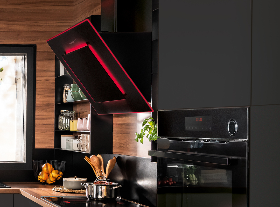 Neben ihrer hellen Leuchtkraft sorgt die Kaminhaube mit einem speziellen Lichtkonzept für eine angenehme Wohn- und Arbeitsatmosphäre. Die Ränder der beiden Glasschirme der Dunstabzugshaube lassen sich effektvoll beleuchten: Von warmen Rot über Orange, Gelb, Grün, Lila bis zum kühlen Blau – einfach über das Display je nach Tageszeit und Stimmung einstellen und genießen.