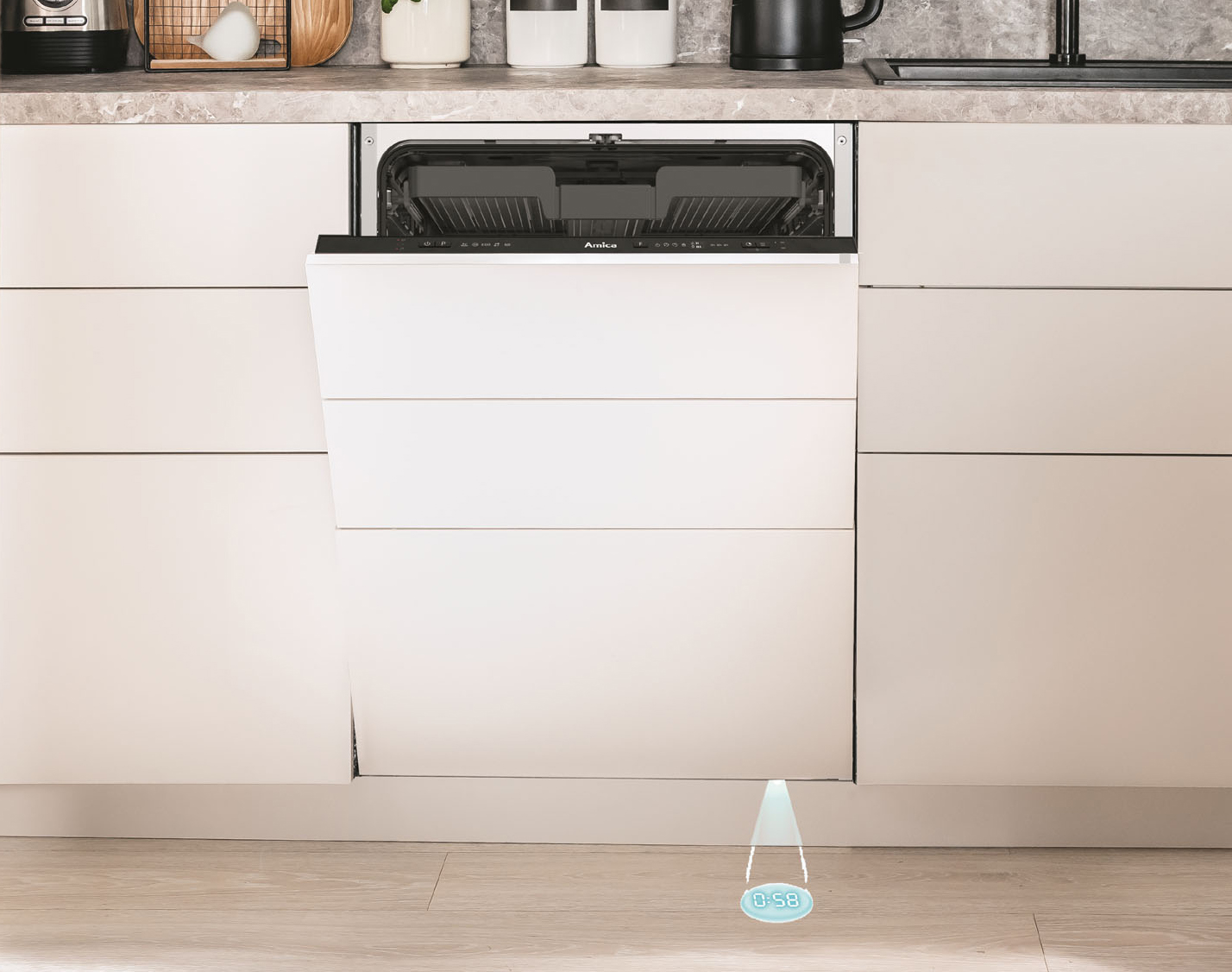 Die FloorIndicator Funktion projiziert die Restlaufzeit des jeweilig aktiven Spülprogramms oder das Programmende auf den Fußboden. Die Anzeige bringt Klarheit und Komfort in den Küchenalltag ohne zusätzliche Displays oder Apps, die für einen Überblick installiert werden und ohne die Tür zum Nachschauen öffnen zu müssen.