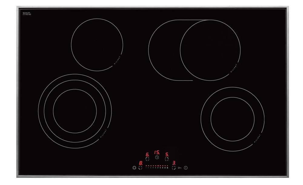Die vier Zonen, die als Normalkochfeld, Zweikreis, Dreikreis oder Bräterzone konzipiert sind, heizen in nur etwa 3 Sekunden auf. Die jeweils erreichte Heizstufe wird über dem Kochfeldsymbol als Ziffer von 1 bis 9 angezeigt. Timer und Restwärmeanzeige für jede Kochzone, Ankochautomatik und Kindersicherung runden die Topausstattung ab.