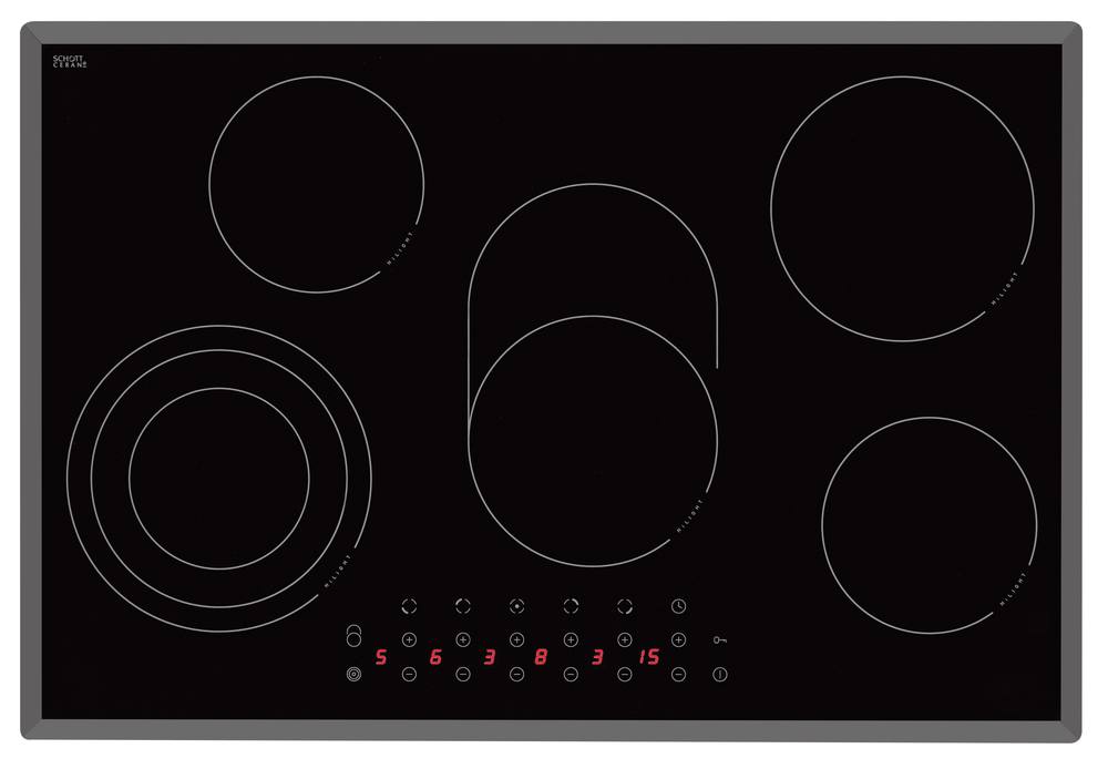 - 1 x Dreikreiskochzone 12 – 17,5 – 21 cm Ø / 0,8 – 1,6 – 2,3 kW, 2 x 14,5 cm Ø / 1,2 kw, 1 x Bräterzone 17 / 17 x 26,5 cm Ø / 1,4 – 2,2 kW, 1 x 18,0 cm Ø / 1,8 kW