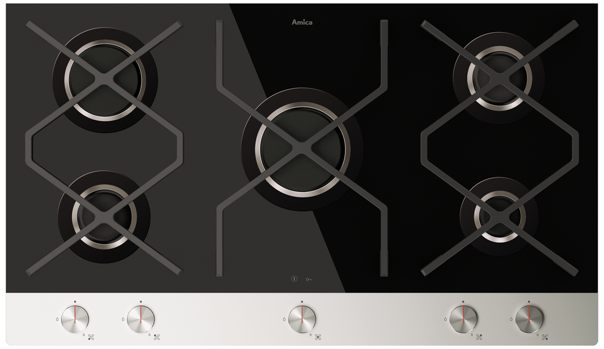 Das Amica Kochfeld IN. KMG 63100 C ist ein 90 cm breites Gas-Glaskochfeld. mit 5 Feldern. Das Kochfeld bietet thermoelektrische Zündsicherung, Ultrarapid- und Starkbrenner, integrierte Knebelsteuerung. Ebenso zur Ausstattung gehören elektronische Einhand-Funkenzündung, beleuchtete Aluminiumknebel und Aluminium-Bedienblende.