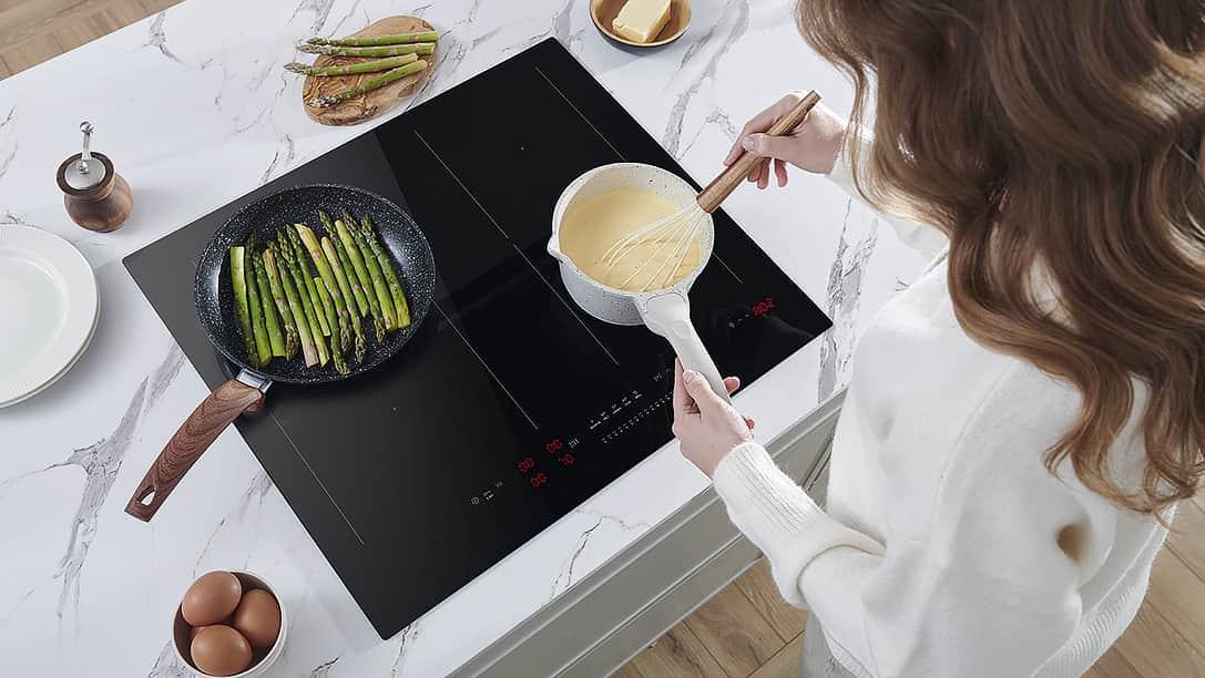 Fünf autarke Induktionskochfelder bieten intuitive Bedienung und einen leisen Betrieb bei konstanter Leistung. Schwierige Einbauverhältnisse in dünne Arbeitsplatten sind kein Problem für die neue Generation der Induktionskochfelder. Sie benötigen keine Frontbelüftung, sind gerade einmal 44 mm stark.