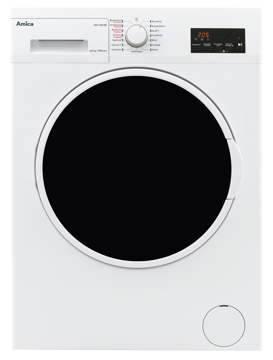Der Amica Waschtrockner WAT 489 000 bietet ein Fassungsvermögen für bis zu 8 kg Wäsche zum Waschen und bis zu 6 kg Wäsche zum Trocknen. Kleinere Wäschemengen können in einem Durchgang ohne Umladen gewaschen und getrocknet werden.