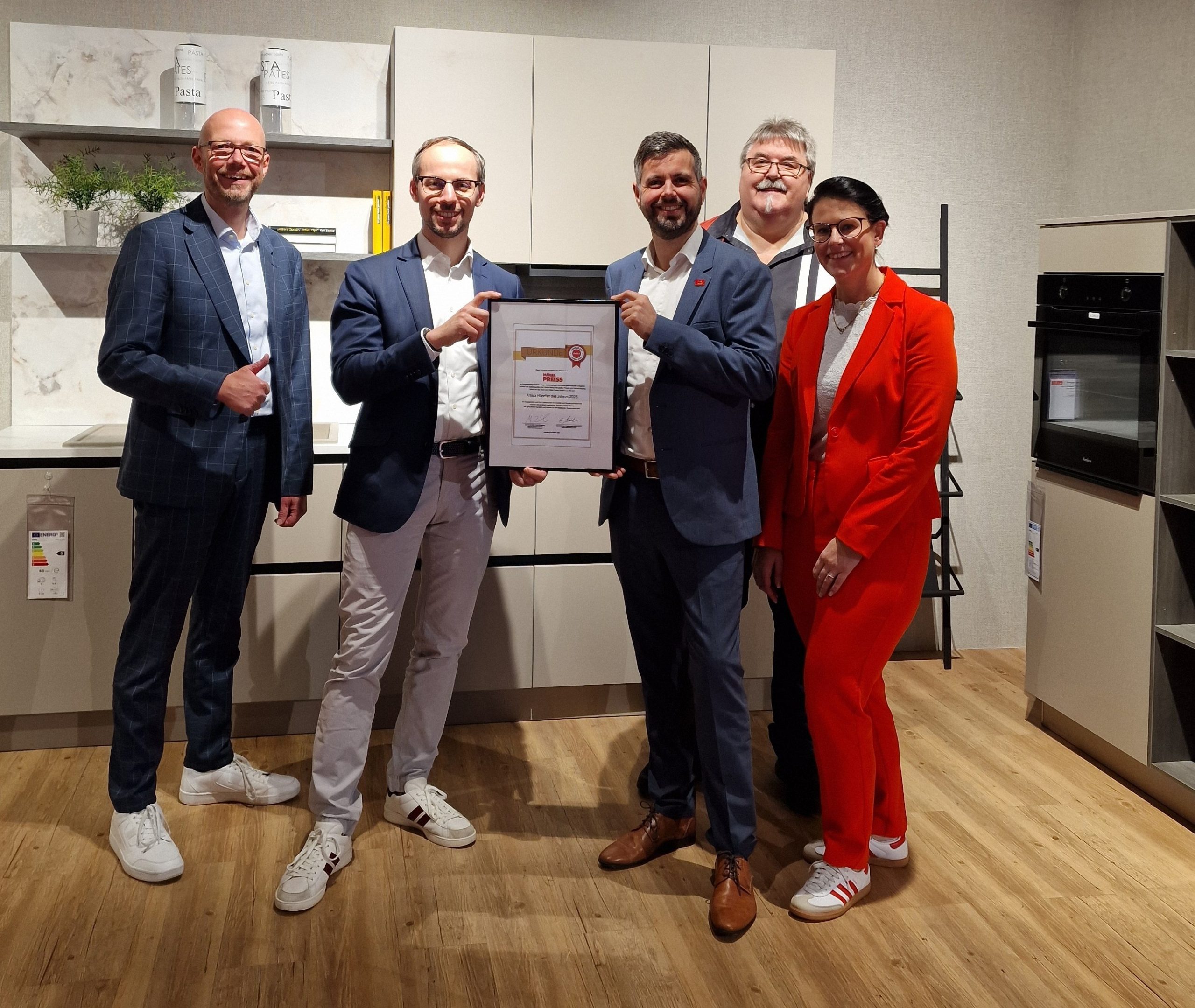 Personen von links nach rechts: Björn Oberhausen (Verkaufsleiter Küchen Möbel Preiss), Sebastian Preiss (Geschäftsführer Möbel Preiss), Marcel Kühn (Sales & Marketing Director Amica), Erich Buchmann (Regional Sales Manager Amica), Theresa Leitinger (Key Account Manager Amica). Die Auszeichnung „Händler des Jahres 2025“ geht auf die Nominierung durch den Amica Außendienst zurück – als Anerkennung für überzeugende Leistung und gelebte Partnerschaft.
