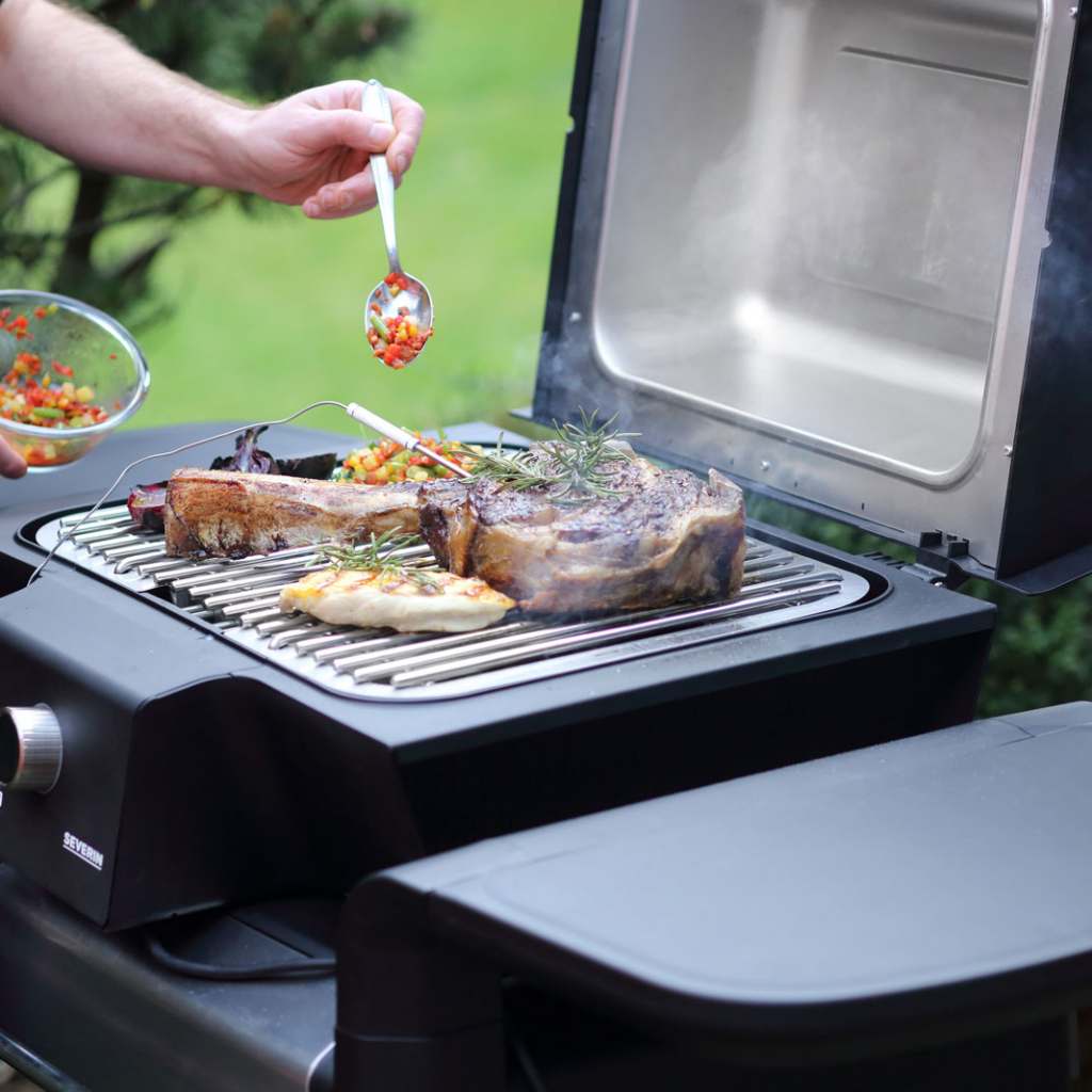 So eröffnet die Kombination aus konstanter Temperatur in Verbindung mit Wasser oder beispielsweise Apfelsaft oder Rotwein in der Reflektorschale beim Grillvorgang ganz neue Geschmackswelten. Dafür wurden die bestehenden Sevo-Modelle mit passendem Zubehör ergänzt. Pulled Pork mit Raucharoma durch eine Smoke-Box auf dem Elektrogrill ist vielleicht ungewohnt, aber geschmacklich überragend. Ebenso funktionieren der neue Pizzastein, das Gusseisen-Rost und die Planchaplatte perfekt auf diesen Grills.