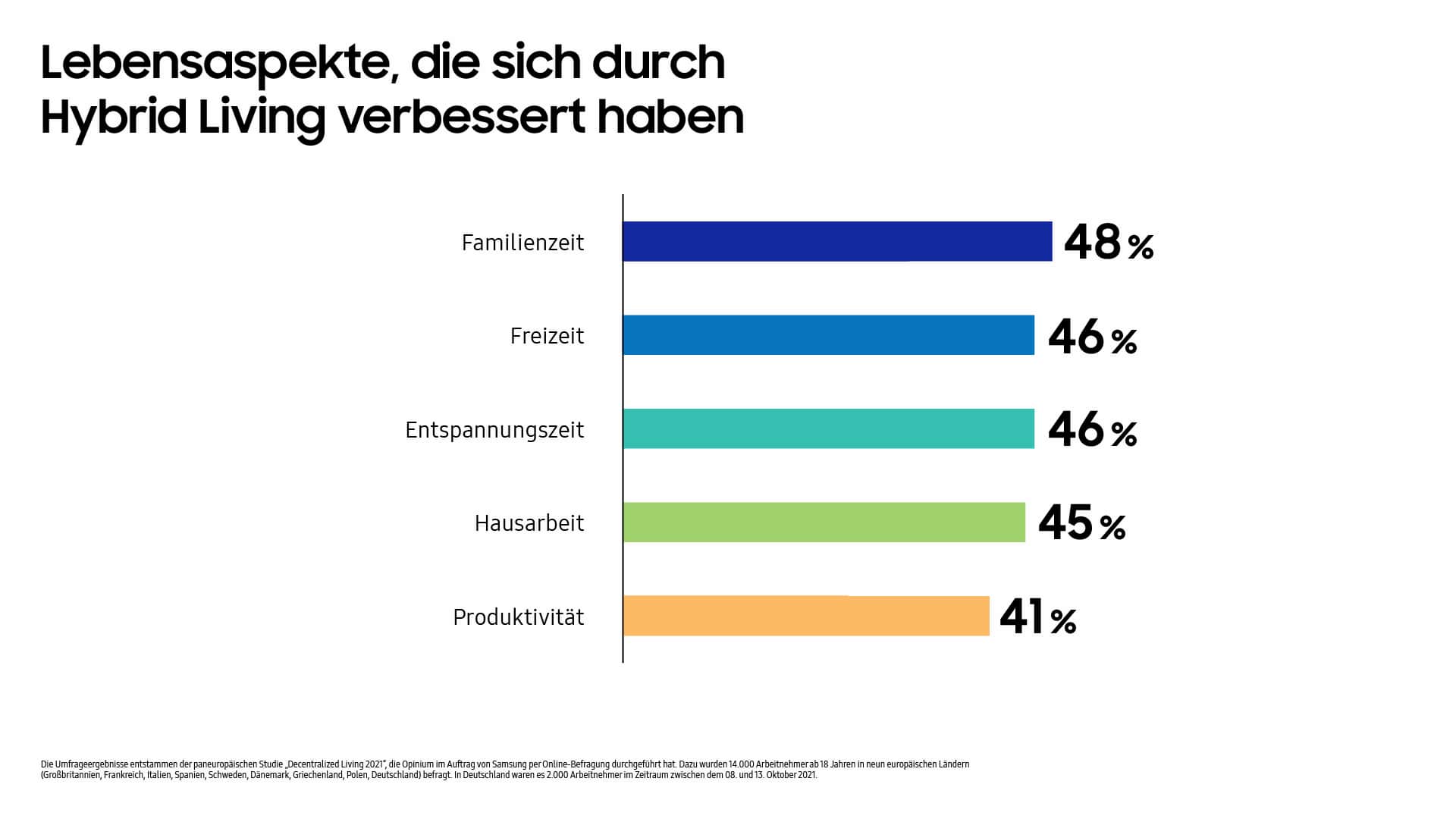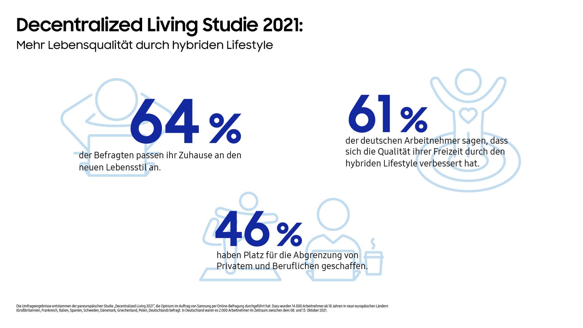 Von 2.000 befragten deutschen Arbeitnehmern gibt mehr als jeder Zweite an, mittlerweile einen hybriden Lebensstil angenommen zu haben. Für viele hat das positive Effekte: Sie genießen ein Plus an freier Zeit und gestiegene Freizeitqualität. Das ist das Ergebnis einer von Samsung in Auftrag gegebenen paneuropäischen Studie „Decentralized Living 2021“.