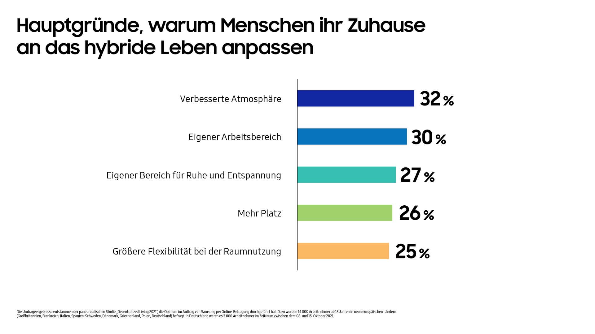 Der veränderte Lebensstil führt häufig auch zu Veränderungen in den eigenen vier Wänden. Viele Befragte haben das Bedürfnis, ihr Wohnumfeld an den neuen, hybriden Alltag anzupassen: Knapp zwei Drittel (64%) haben die Gestaltung ihres Zuhauses bereits am neuen Lebensstil orientiert oder schmieden Pläne zur Umgestaltung. Dazu gehört die Umwidmung bestehender Räume für einen anderen Zweck (54%), zum Beispiel, wenn der offene Wohnbereich nun nicht nur Küche und Wohnzimmer, sondern auch Büro ist.