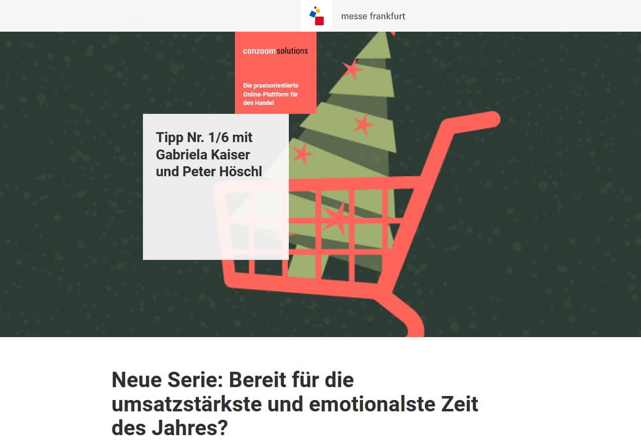 Auf Conzoom Solutions geben E-Commerce Experte Peter Höschl und Trendexpertin Gabriela Kaiser von August bis Januar regelmäßig Tipps, worauf es ankommt, um das Weihnachtsgeschäft gut vorzubereiten, entscheidende Stellhebel zu nutzen und den Point of Sale bis zum Fest und darüber hinaus aufmerksamkeitsstark zu inszenieren.